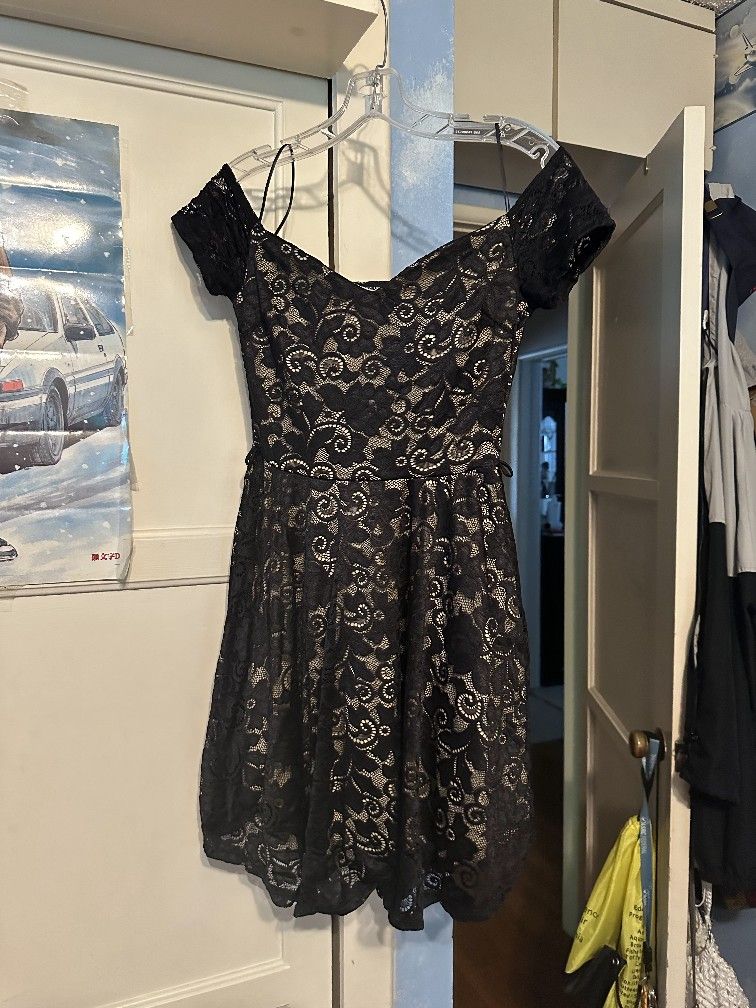 Little Black Dress: size M, Black lace, off the shoulder, medium short length, soft material inside so it does not scratch, top part is to the body. Long Shiny Dress: Perfect for prom, Size M, has a V front style, open back with a corset style tie up, Rose Gold with some sequence, glitter cloth, and a thin gem belt as an accent, Slit on the leg, full lenth. Short shiny dress: Size L but fits like a loose M, Rose gold cloth with Gold accents, off the shoulder, Layered lace on the bottom part, comes with a thin shawl. Long Pink Dress: Size M, to the body light pink dress with Black velvet flower accents, mermaid style, a little open back, soft material.
