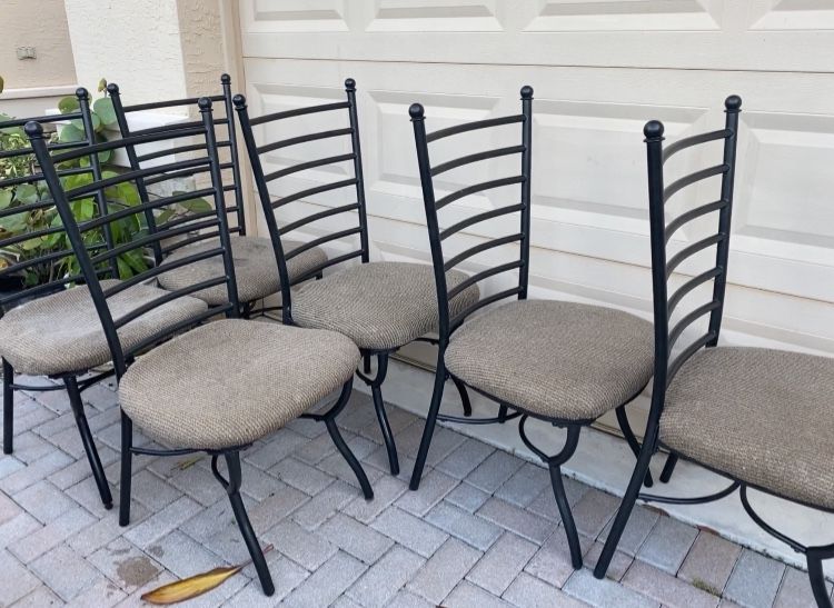 Chairs are in need of cleaning, and one seat needs to be screwed back into the base of the chair. Can be renewed by changing out fabric base