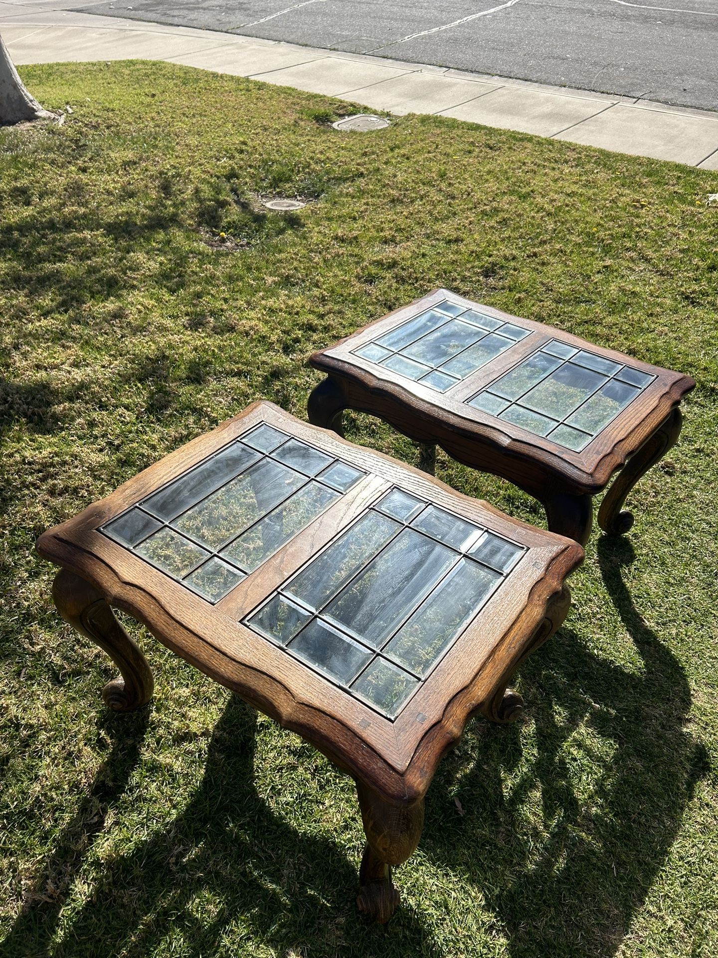 Two vintage side tables Style: Traditional / Old-World (often called Spanish Revival or Mediterranean) • Era: Likely 1950s–1970s • Material: Solid hardwood (oak or walnut is common) • Top: divided glass panels set into wood (removable) • Legs: Cabriole legs with carved feet • Use: End table or small coffee