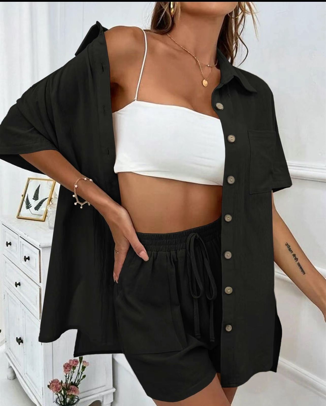 Brand New- Women’s Solid Button Front Shirt And Drawstring Shorts Set Women’s Size Medium