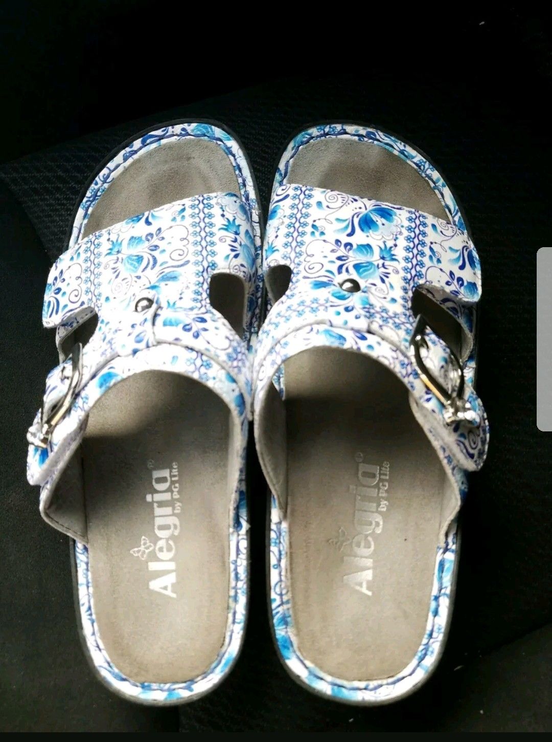 Alegria White Blue Floral Leather Wedge Sandals Sz 36.
