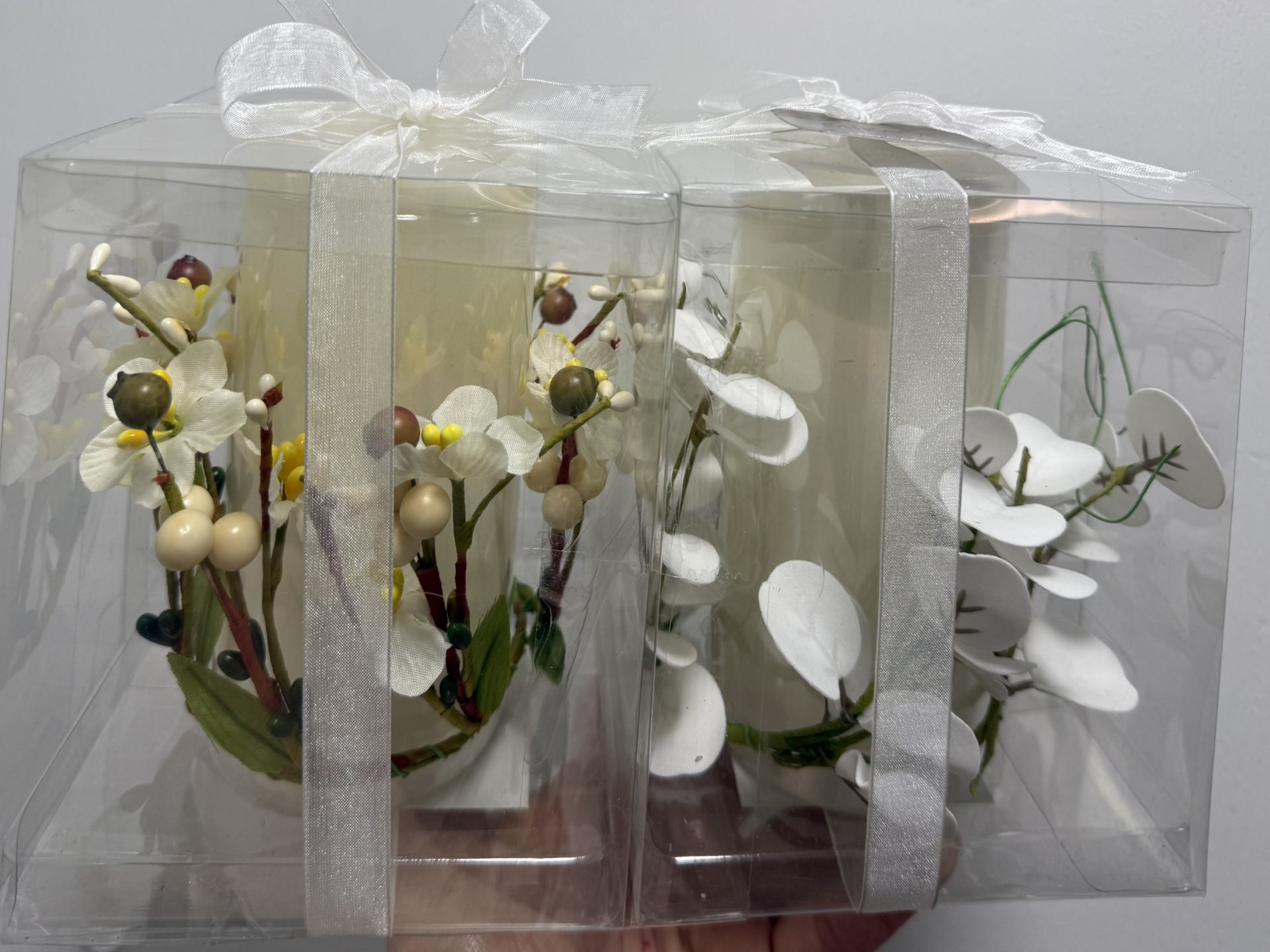 Set of 2 Mikasa White LED Wax Pillar Candles. NEW 2 different candle rings. One eucalyptus & one flowers Flickering effect 3"H x 3"W x 6"D Paraffin Requires 2 AA batteries (not included) Centerpiece, romantic, home decor