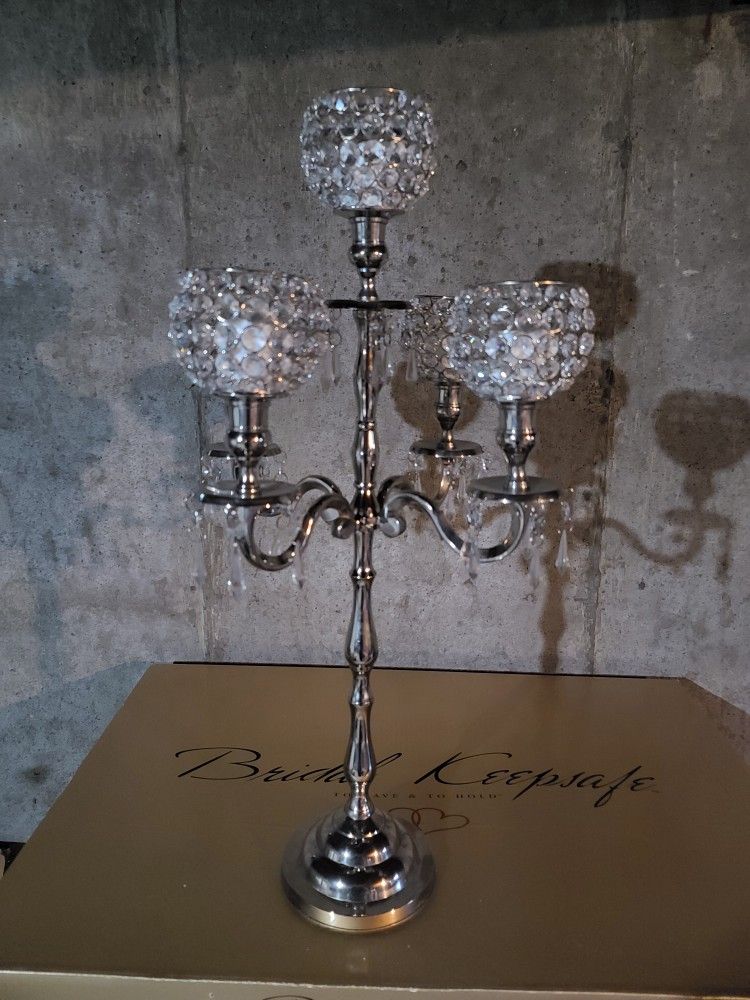 Used but in brand new condition. silver crystal tall candle holder for tables. I have two. $60 each.