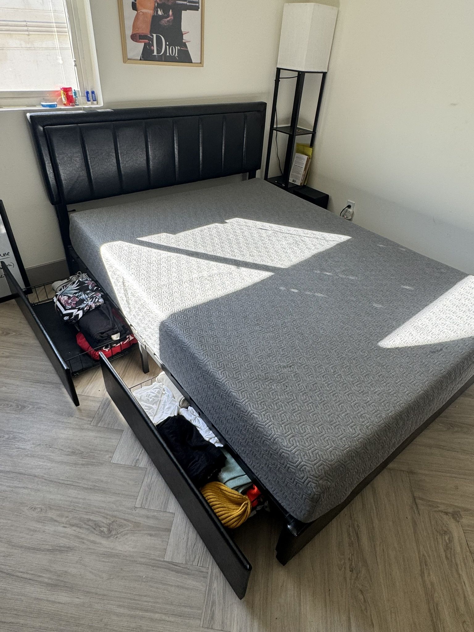 Queen size upholstered platform bed frame with built-in storage drawers. Includes 4 sliding storage drawers and 10โ gel memory foam mattress. No box spring needed. Mattress is comfortable and supportive. Bed frame is sturdy and in great condition. Perfect for apartments or small bedrooms because of the extra storage. Selling due to upcoming move. ๐Pickup in Sherman Oaks Can help disassemble if needed.