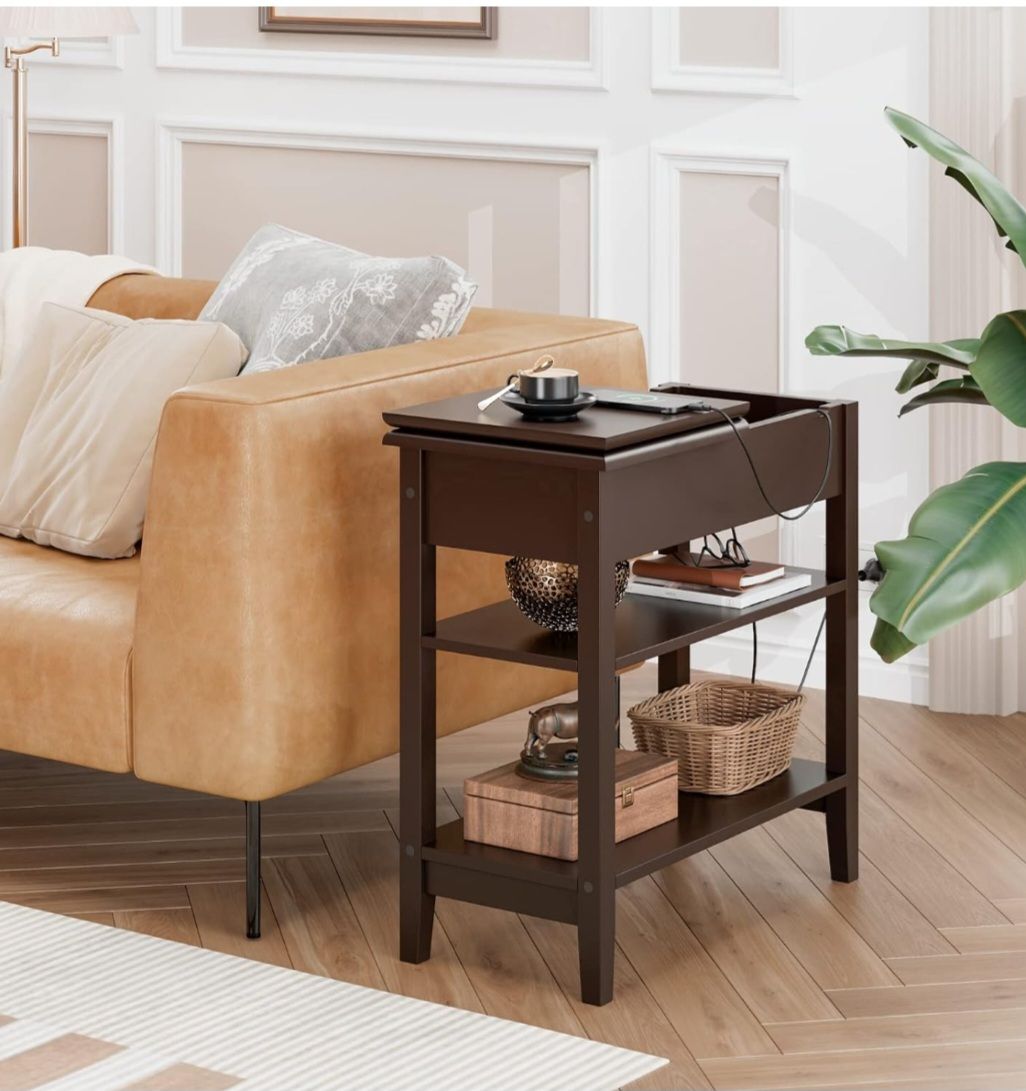 End Table with Charging Station, 3 Tier Narrow Nightstand with Storage Shelf, Slim Side Table with USB Ports & Power Outlets for Living Room, Bedroom, Office, Dark Brown