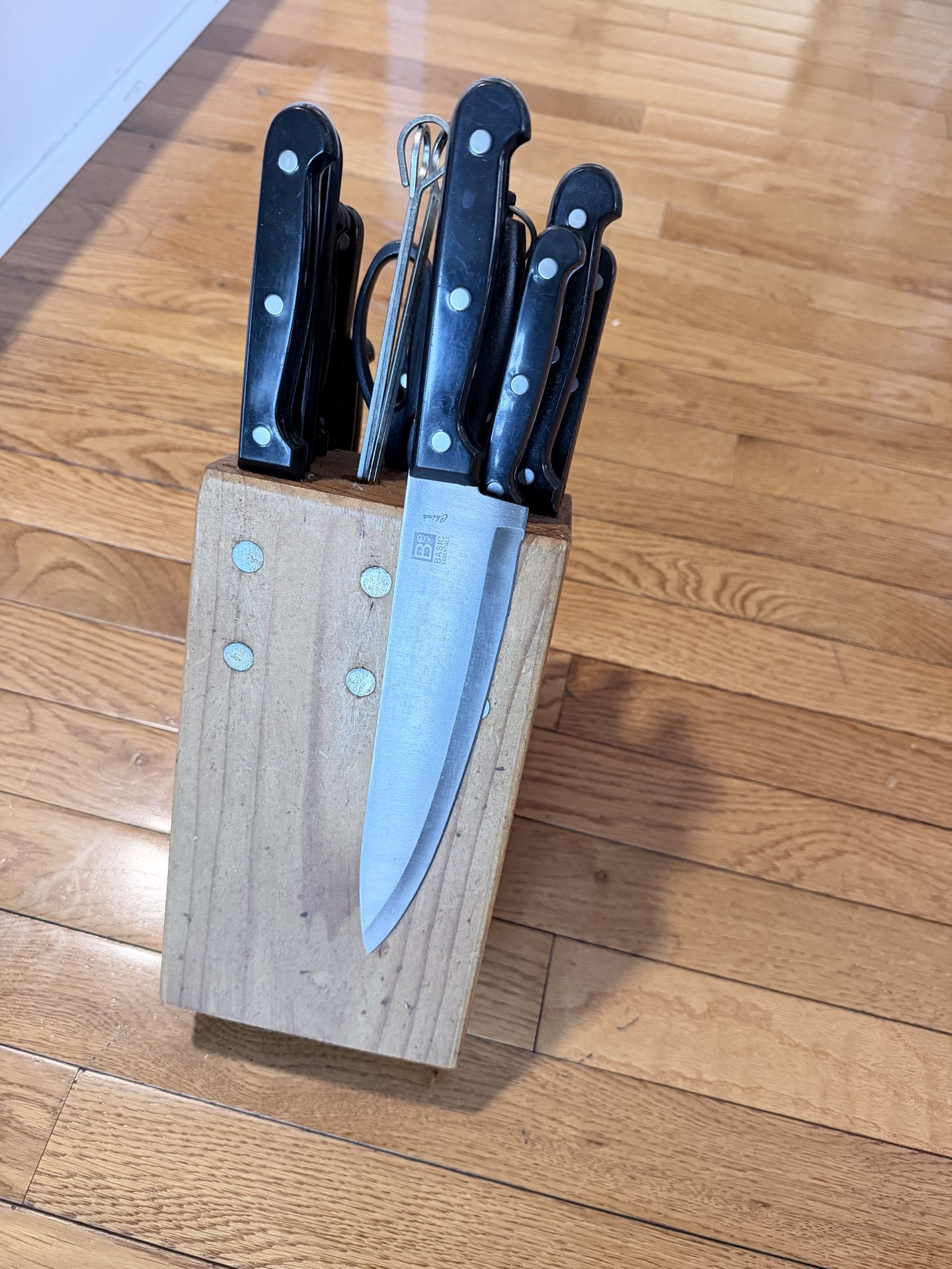 ***Used Knife Set*** These knives are wore but have never been sharpened. You will probably need to get these knives professionally sharpened. Full Set 8 Steak Knives Scissors Metal skewers Knife sharpener Paring Knife Boning knife Chef knife Bread knife Carving knife And other knives Good starter knives set.