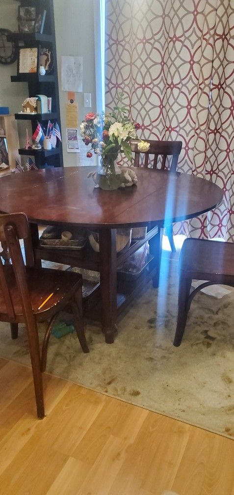 Well loved round, adjustable dining table with four chairs. Also comes with 4 chair cusions. Very sturdy, solid table. Minor superficial scratches a coat of paint or polish will easily fix.