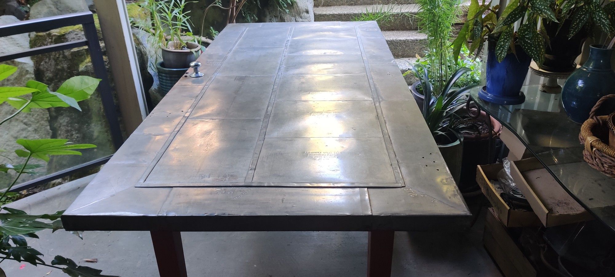 Really cool vintage steel fire door. It has been used as a table as shown but would be sweet as a sliding door too. The side that's facing down on the table is a medium to dark brown color. It's in great condition! The wood table frame is dark red and has copper feet. Size is 80" x 36" x 1.75" $700.00 Pickup in North Capitol Hill, Seattle.
