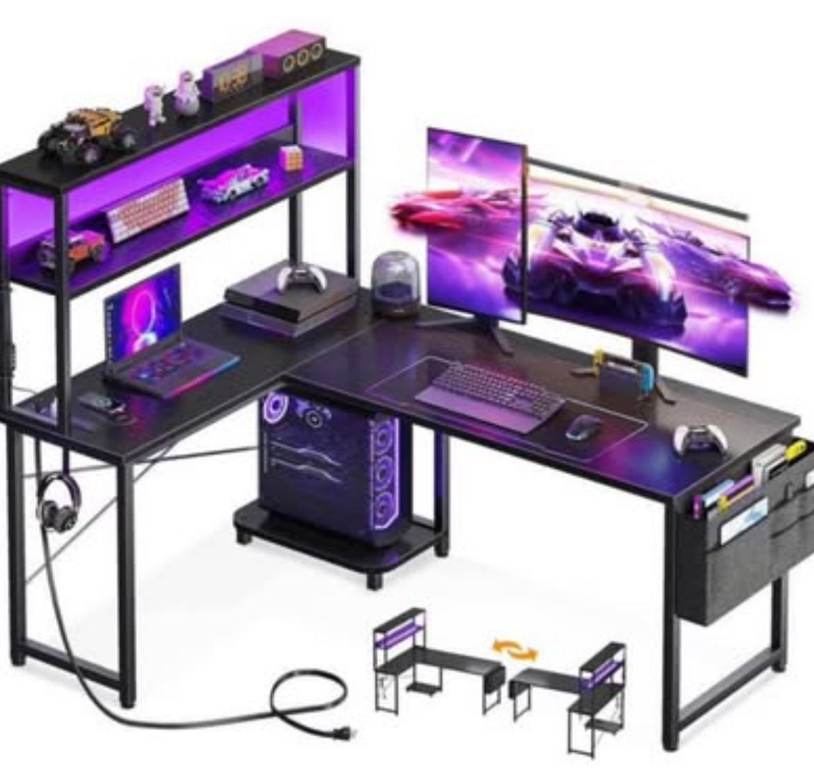 Condition: Brand New in Box. Available sizes: 43 inch $55 53 inch $65 61 inch $75 Enhance your gaming or work-from-home setup with this 53-inch reversible L-shaped desk. Designed for maximum efficiency in a compact footprint, it blends high-tech features with smart storage solutions. Key Features: • Integrated Tech: Built-in power outlets for your hardware and LED lighting to create an immersive gaming or work environment. • Reversible Layout: Can be assembled as a left or right-hand corner desk to perfectly fit your room. • Storage Solutions: Includes an integrated shelf, a side storage bag for files/controllers, and a dedicated headphone hook. • Durable & Stylish: Modern design that provides a spacious L-shaped surface for dual-monitor setups. • Versatile: Perfect as a PC gaming command center, a study table, or a professional home office desk. Available Colors: • Black (0184-1) Pickup Info: • Easy Pickup: Still in the original box • First come, first serve