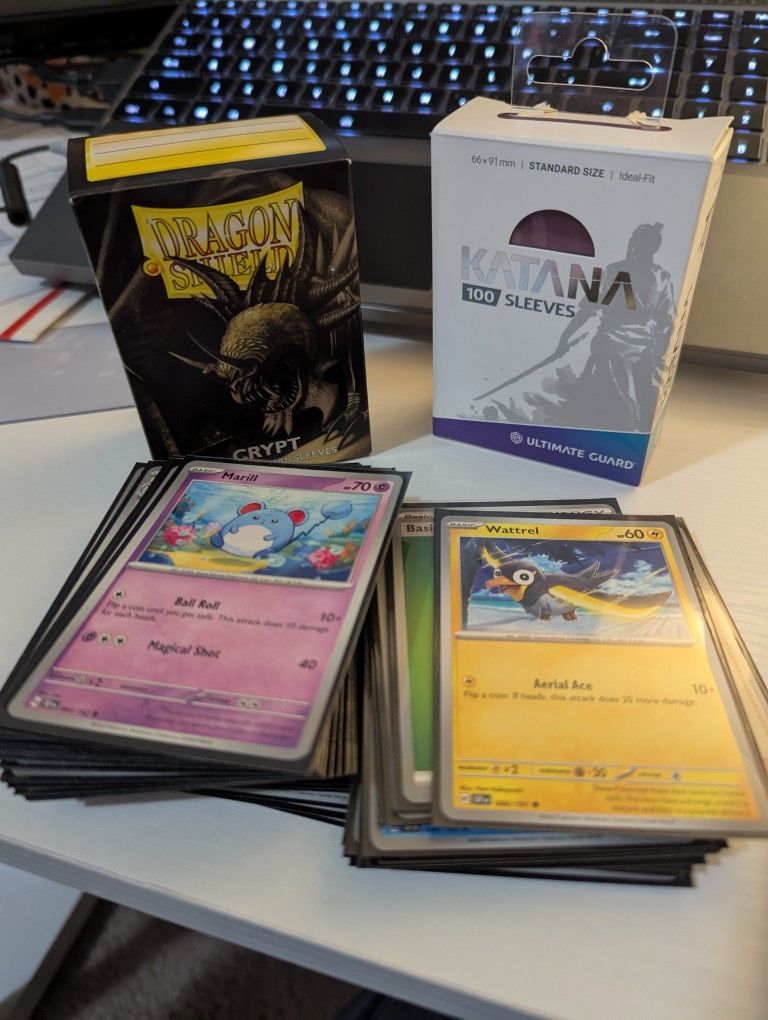 Card sleeves were opened for testing only. Very lightly used. The bundle of pokémon cards includes 62 cards. Katana sleeves and dragon shield sleeves are high quality card sleeves ready for competitive play!