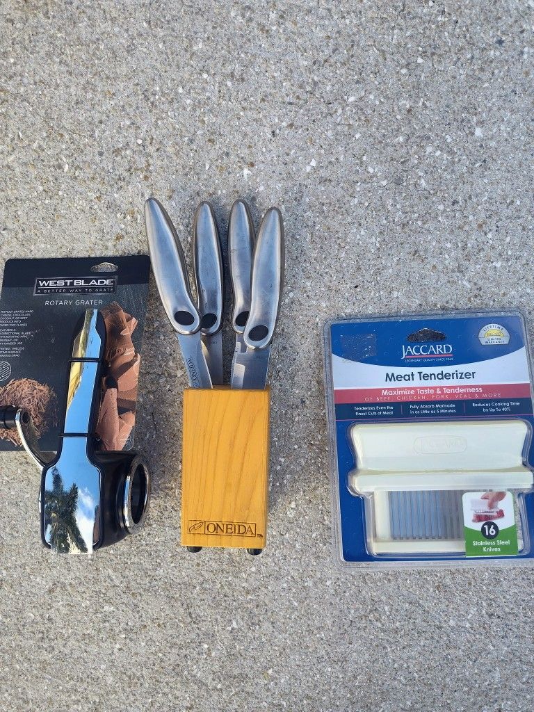 Oneida 4 piece steak knives in wooden block, ( like new) & NEW meat tenderizer & new notary grater $15. All 3 items.