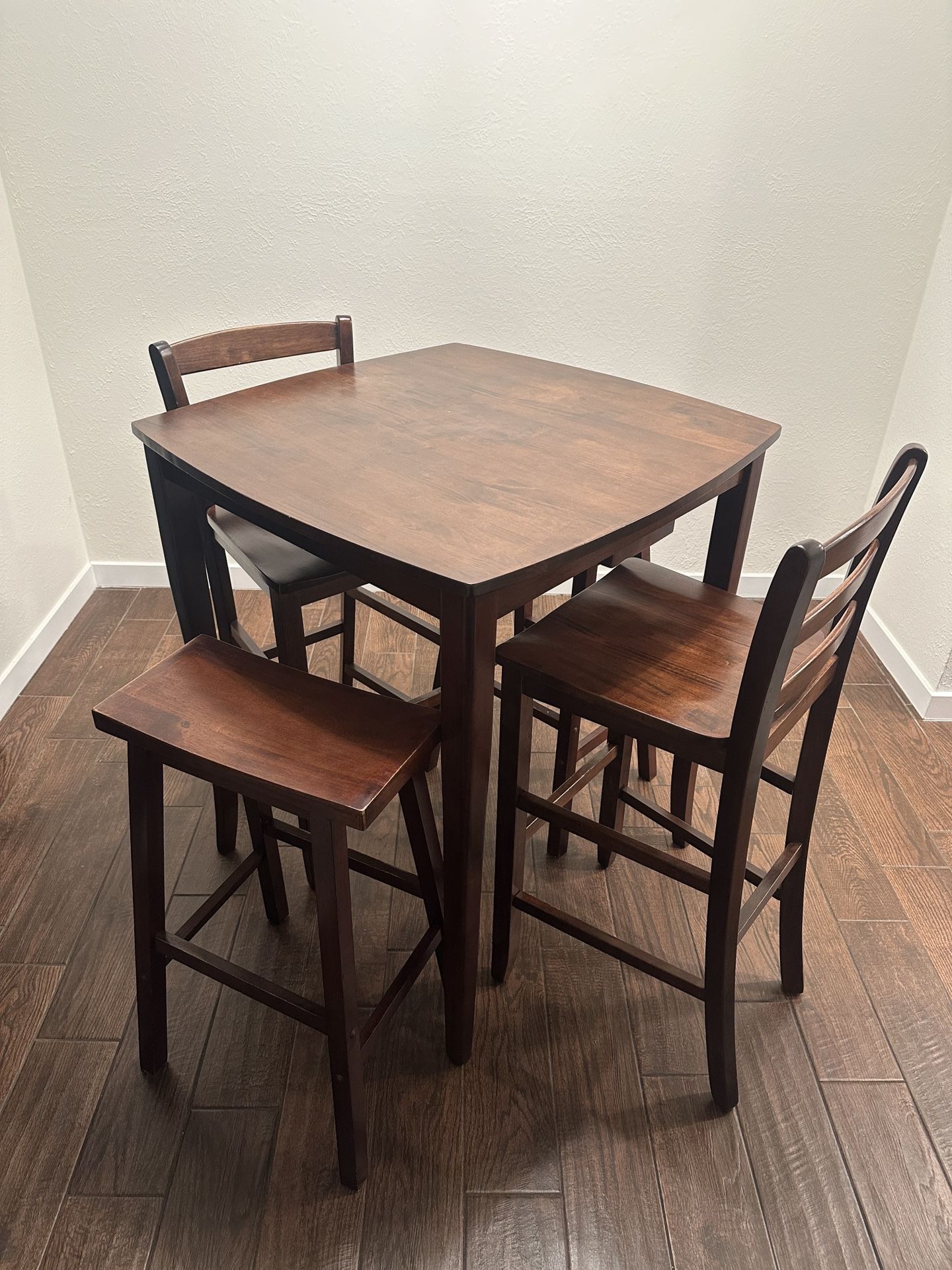 Top: 34" × 34"; Height: 39" This is a beautiful counter-height dining table set made of sturdy wood with a rich, warm finish. The set includes one square table and four matching seats—two chairs with backrests and two backless stools. It’s perfect for kitchens, apartments, or small dining spaces, offering a cozy and stylish place to eat, work, or gather. The wood has a smooth, polished look and is in good overall condition with normal minor wear. Great for anyone looking for a compact, durable, and attractive dining setup. Smoke-free home.