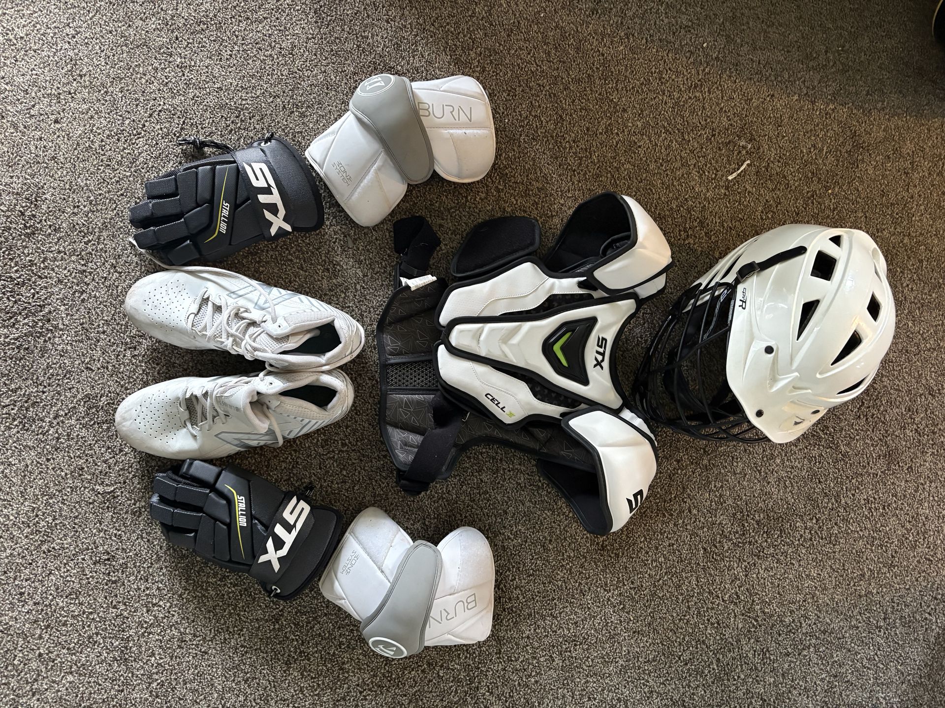 Worn less then 10 times Helmet, chest pad, elbow pads, gloves, US size 9 cleats, lacrosse short stick and head, gear bag $130 obo Willing to sell individual pieces Pick up in chico