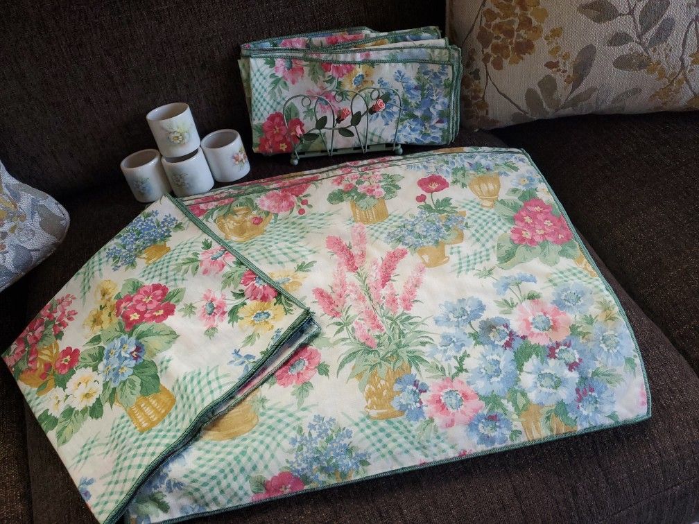 Such a sweet shabby and chic set of 4 placemats and matching napkins with lovely floral garden design. Also included are 4 napkins rings which are either ceramic or porcelain with painted flowers. Also included is a really pretty green metal Napkin ring holder with pink roses. Some of the Placemats have some light stains which might be able to be washed out. But all still are so pretty for using for a tea lunch. Thanks for looking. All included for only $15. Thanks for looking.