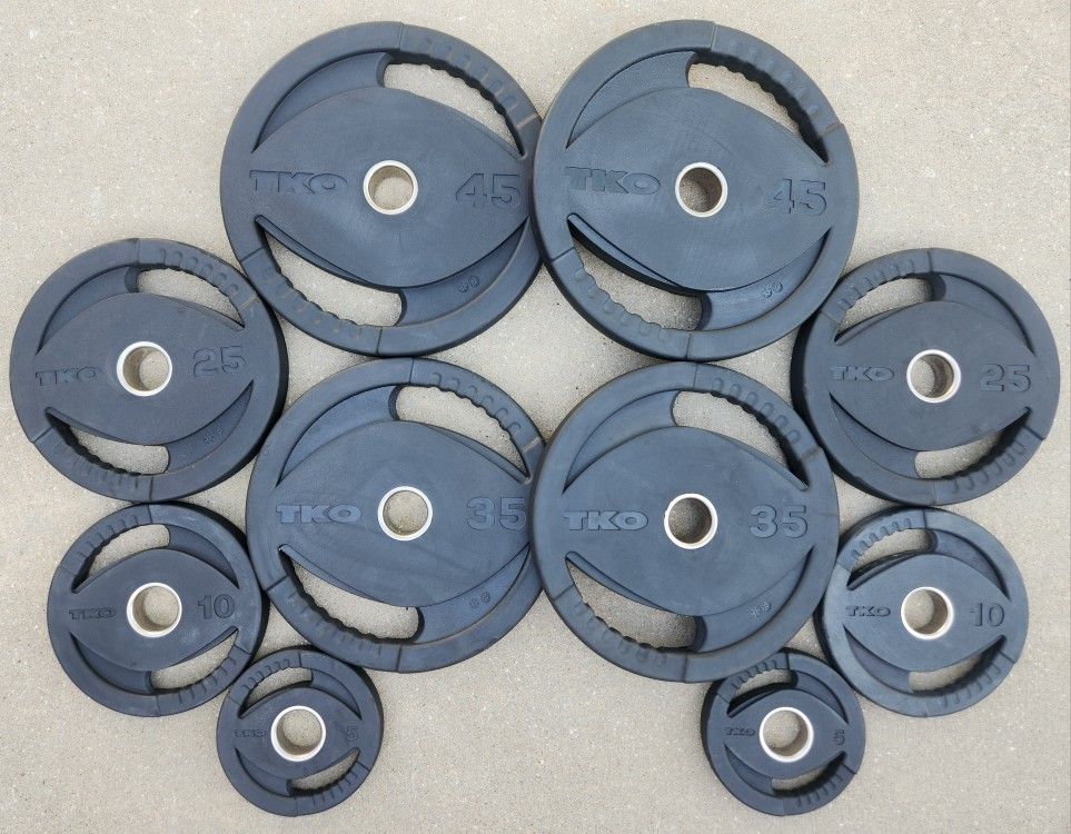 EXCELLENT LIKE NEW CONDITION!! Virgin Rubber Commercial Grade Olympic Plates!! Includes: 2 - 45lb TKO Rubber Grip Plates 2 - 35lb TKO Rubber Grip Plates 2 - 25lb TKO Rubber Grip Plates 2 - 10lb TKO Rubber Grip Plates 2 - 5lb TKO Rubber Grip Plates Retail is over $656 after shipping, but first $480 cash takes them! Package deal only, delivery available. I also have iron plates, bumper plates, iron and rubber dumbbells, kettlebells, barbells, benches, commercial racks, treadmills, etc. just look at my other items or send me a message about them. TKO Olympic Rubber Grip Plate provides years of trouble free performance without cracking, fading, or damage to floors and equipment. Solid steel insert ensures a precision fit for a more effective workout tool. Bi-lateral Grip design Durable, non-odor rubber encased Provides years of trouble free performance without cracking, fading or damage to floors and equipment Solid steel insert ensures precision fit