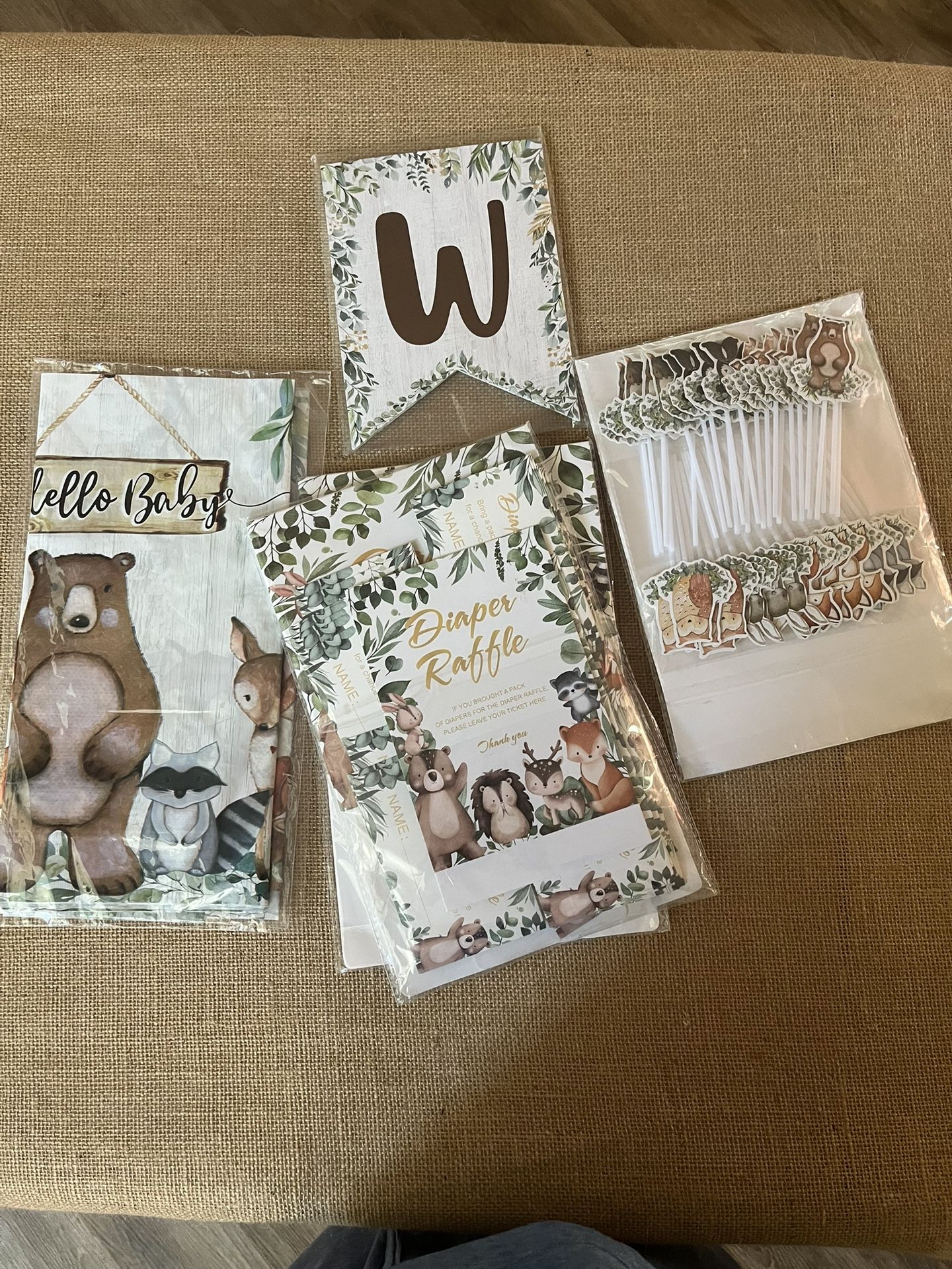 2 table plastic table covers 1 pack diaper raffle-gender reveal 52 pieces 1 welcome baby banner 1 pack cupcake topper 49 pieces 25 invite cards and envelopes Pack 24 baby predictions game cards