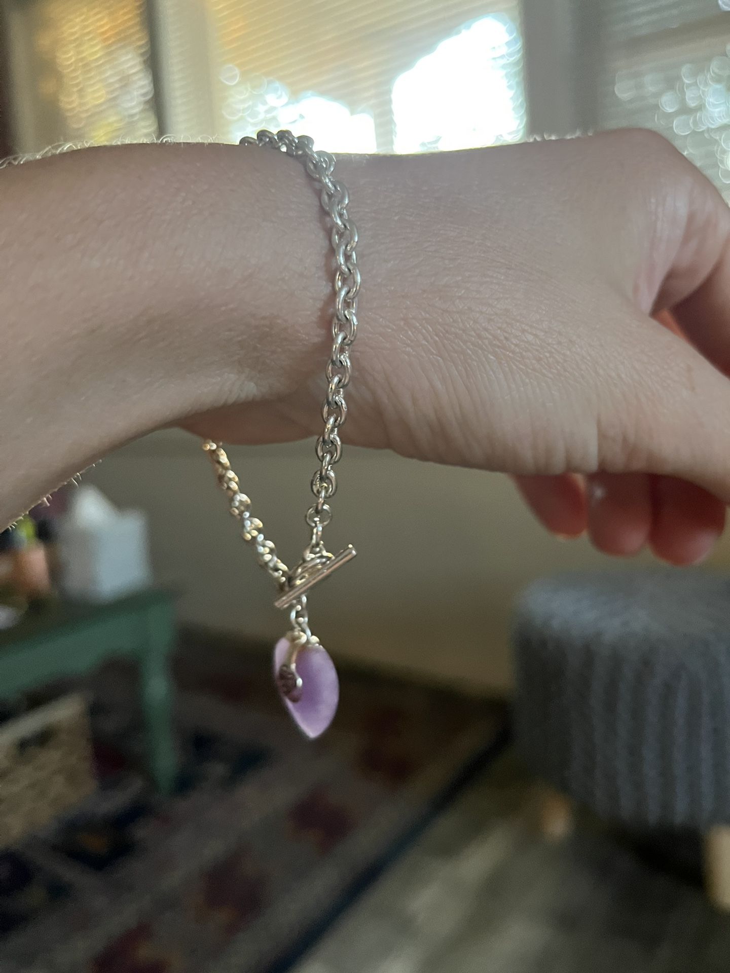 Adorable genuine amethyst heart charm bracelet in sterling silver. The heart says “love” in Chinese.