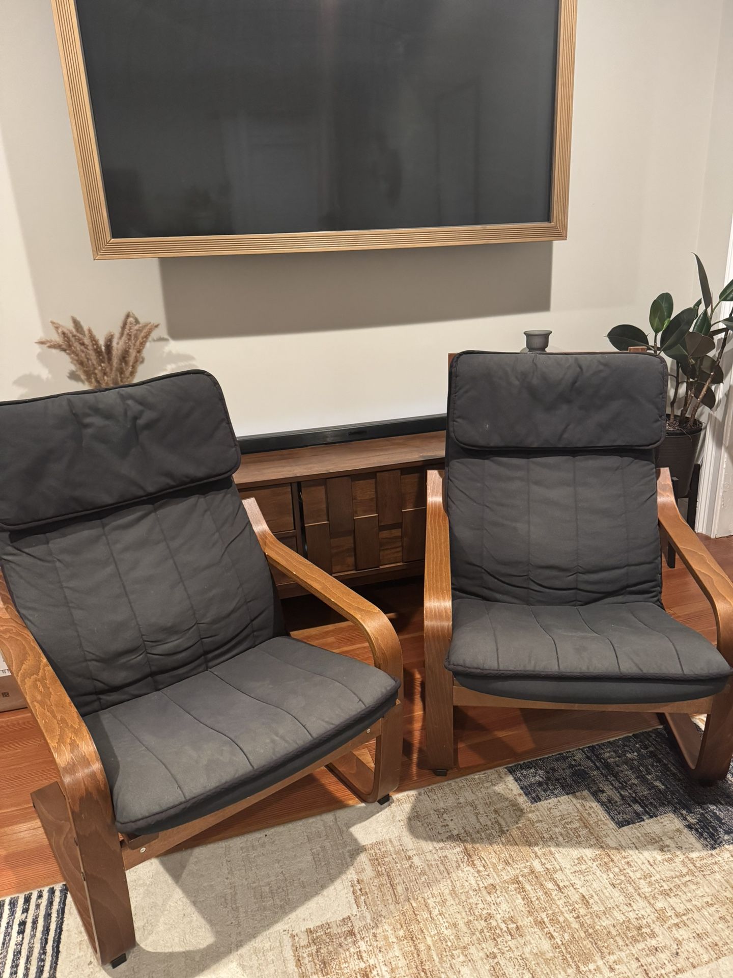 2 walnut frame poäng chairs in good condition. Seat covers are machine washable and can be replaced. Smoke free home. Measurements in last photo. $70 for both chairs