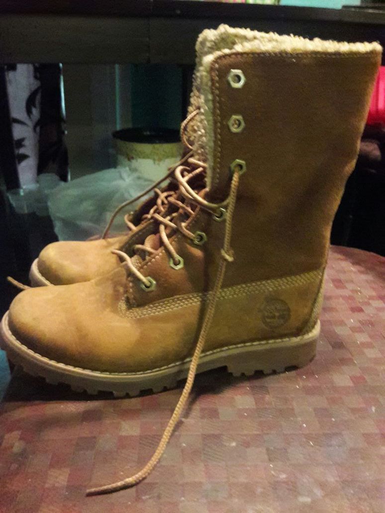 girls size 1 Timberland boots. they look rough but that's the way they came new. I guess it's the new look.