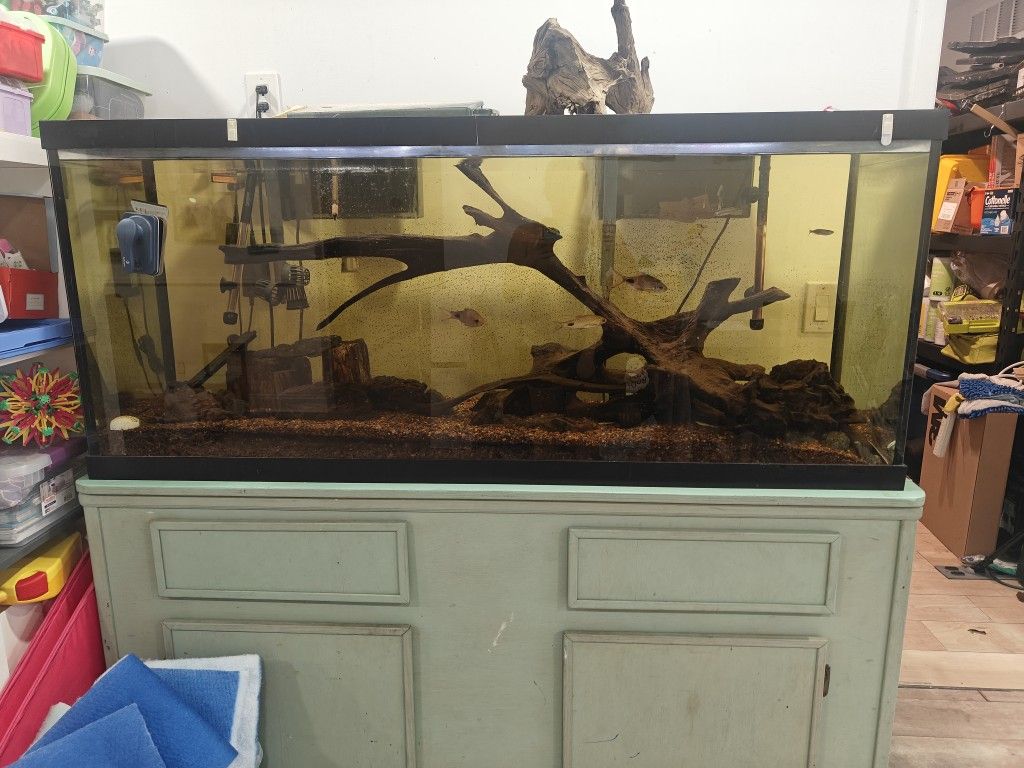 Holds 130 gallons Comes with a large tote box of random fish tank things