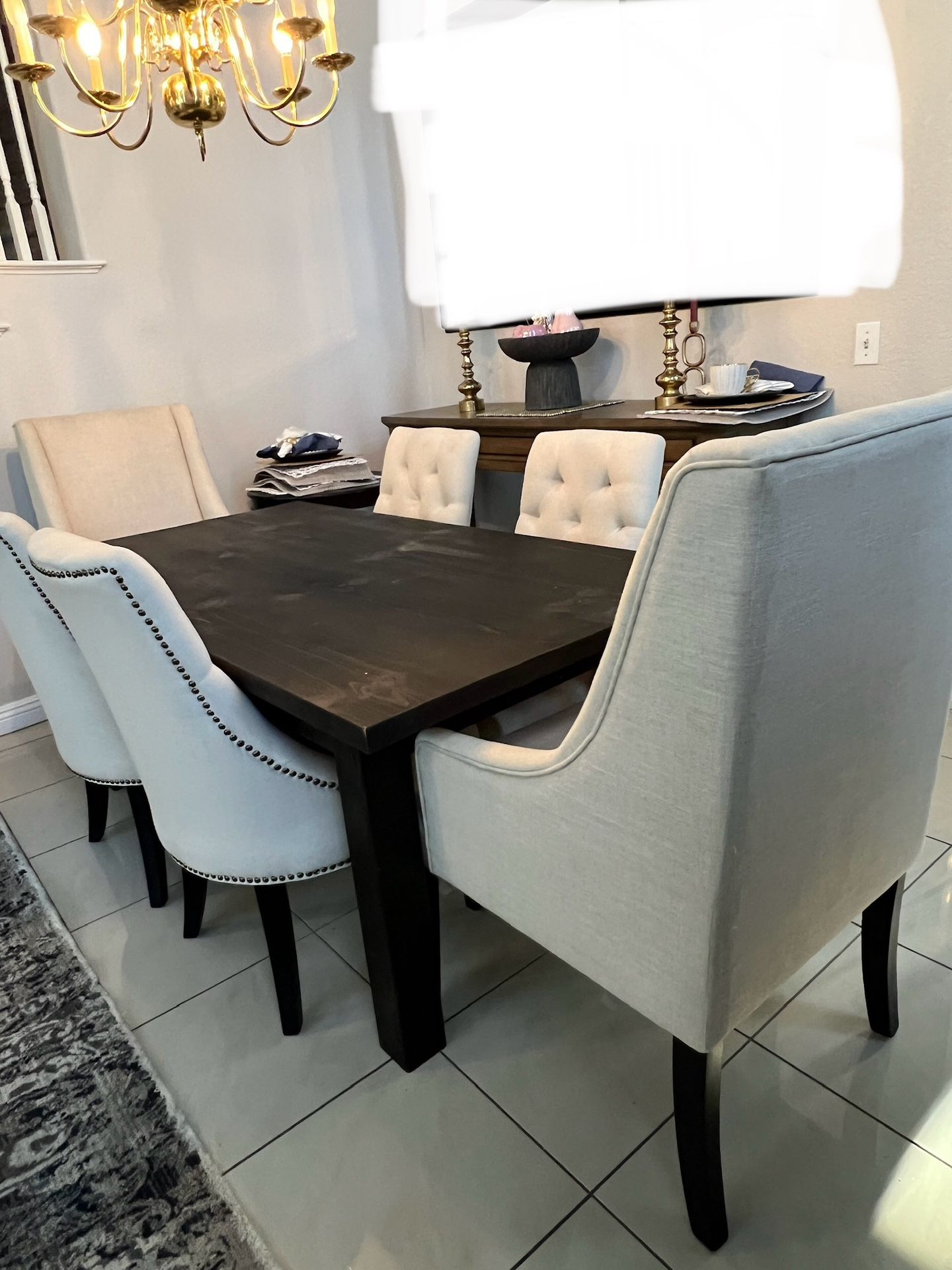 Please take a careful look through photos as they clearly show gentle wear and tear, and stains. *Two End Chairs are taller than the others. Same color. *Must pick up