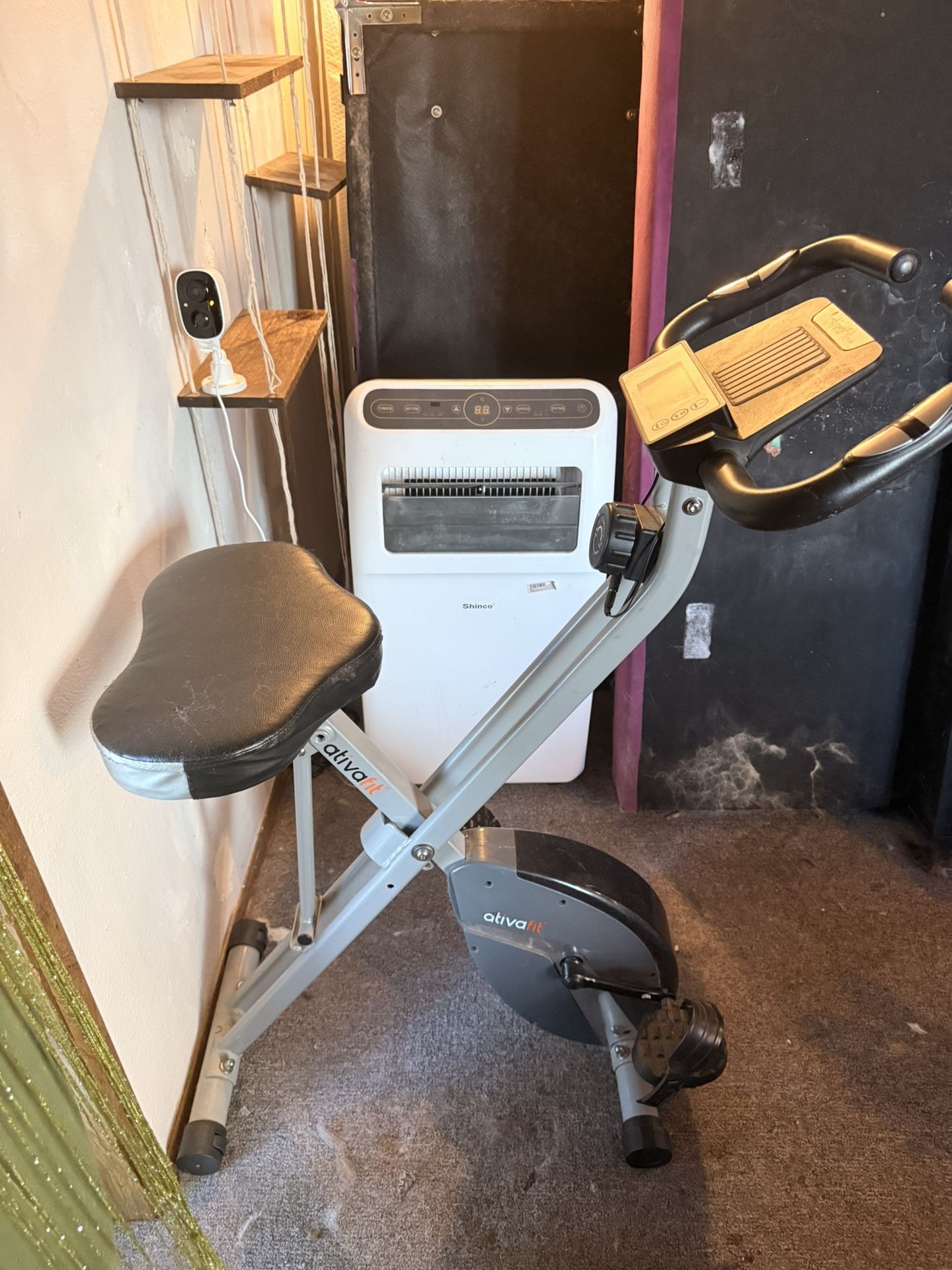 Works great. Folding exercise bike. Seat shows cosmetic wear (see photos), but fully functional. Compact and easy to store.