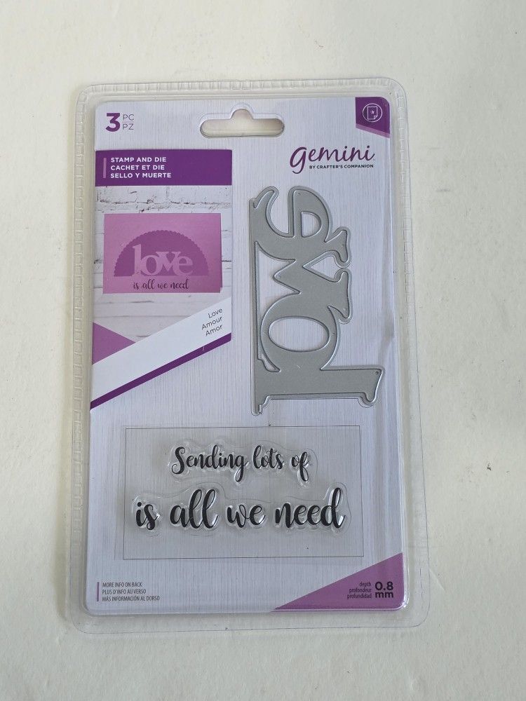 Gemini by Crafter's Companion 3pc Love is all we need Stamp and Die Set Brand new, Sealed, Unopened Die Size 3.25" x 1.7" "Sending lots of Love" "Love Is all we need" Stamp and dies combine effortlessly to create stylish, contemporary cards for all occasions with these fabulous stamp and Edge'able Word Die sets. Each set includes one word die and two co-ordinating clear sentiment stamps. These versatile sets have been designed to work perfectly with A2 landscape, A6 landscape, 6"x 6", 5" x 5" and 5" x 7" card bases