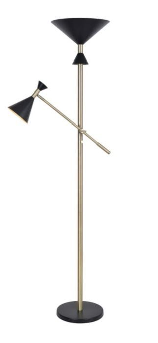 Find bold, trendy Mid-Century Modern style in the mysterious flat black and bright antique brass of this clean-lined floor lamp. Combining high style with functionality, an adjustable arm allows you to reposition a bonus reading light to illuminate your Mid-Century Modern accent chair while the main light fills the room with bright illumination. The conical shades, although finished in a matte black, have a brilliant antique brass lining, amplifying the light for an overall brighter effect perfect for living rooms, bedrooms and home offices. This 73-inch floor lamp provides the perfect amount of classy, retro style for your modern, contemporary, Mid-Century Modern, retro, glam or luxe-inspired home. Features: Retro Modern Style: This Mid Century Modern Floor Lamp Includes A Bonus Adjustable Reading Light And Matte Black Conical Shades. Polished Antique Brass Adds Metallic Charm Dimensions: This Tall Floor Lamp Has A 73 Inch Height, 14 Inch Width, And 30 Inch Length Bonus Side Arm Light: The Adjustable Boom Arm Lets You Customize The Height Of The Bonus Reading Light - Perfect For Task Lighting Lighting Profile: Metallic Conical Shades Create Strong Directional Light That Fills The Room With A Soft Glow Room Placement: Perfect For Home Offices Or Living Rooms Product Dimensions: Height: 72 inches Width: 14 inches Length: 30 inches Weight: 19.09 pounds Ideal for your home office, bedroom or living room, this Arne Torchiere Floor Lamp from Kenroy Home provides the brilliant light you need. You can adjust the swing arm to reposition the task light, so you can comfortably see while reading, working on a craft and more. The sleek finishes of the metal frame, base and cone shades offer a contemporary look that complements your space. Metal frame and weighted base offers stability, durability and a stylish design that coordinates with your décor