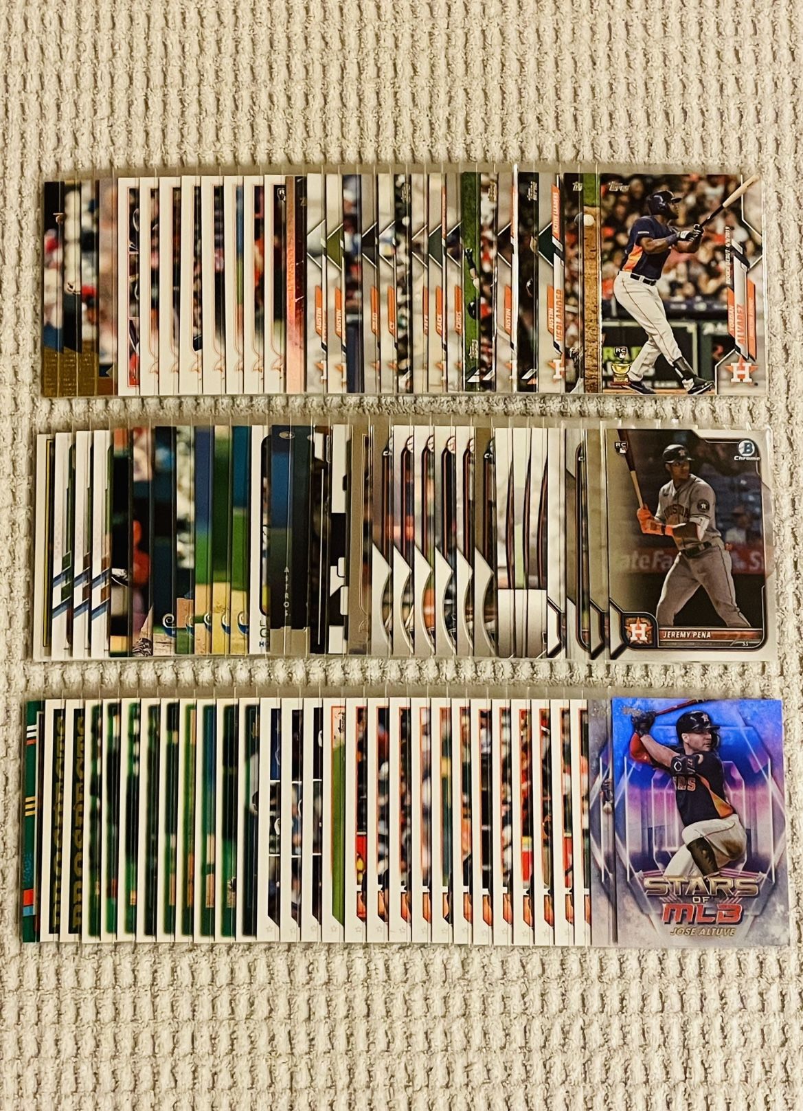 Houston Astros 90 Sports Card MLB Baseball Card Team Lot! All cards in mint condition! Rookies, prospects, All-Stars, HOFers, inserts, parallels, variations & more! Mix of Topps, Bowman, Bowman Chrome, Donruss, Donruss Optic, Topps Chrome, Series 1, Series 2, Update Series, Heritage, Stadium Club, Stadium Club Chrome & more! Jose Altuve, Yordan Alvarez, Kyle Tucker, Jeremy Peña, Alex Bregman, Jose Abreu, Michael Brantley, Justin Verlander, Cristian Javier, Framber Valdez, Luis Garcia, Jose Urquidy, Ryan Pressly, Craig Biggio, Jeff Bagwell, Mike Scott, Shane Reynolds, Billy Wagner & much more! $32 for the lot! Local pick up & shipping available. Message for details. Thank you!