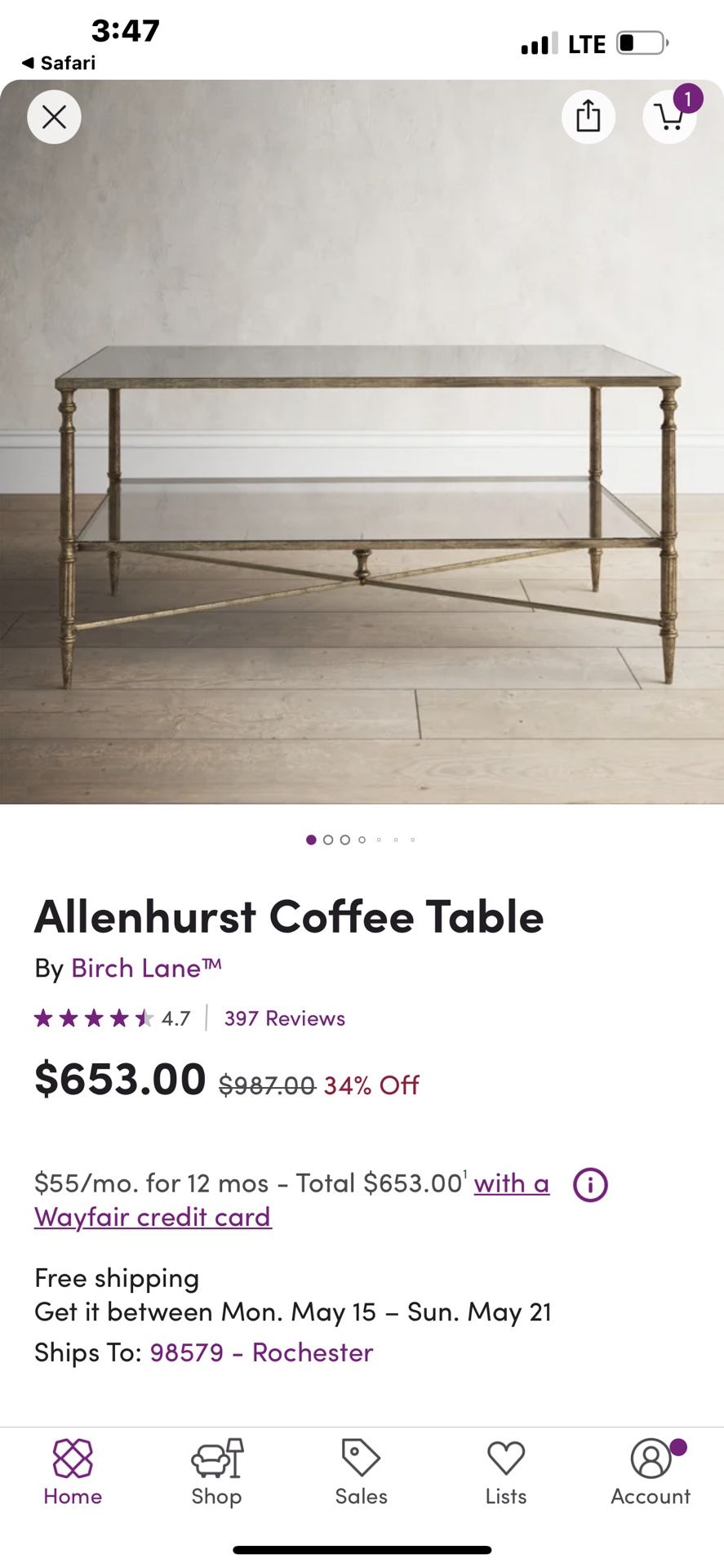 Coffee table with mirror top and glass shelf on bottom. Bronze gold finish. Some scratches on mirror top.
