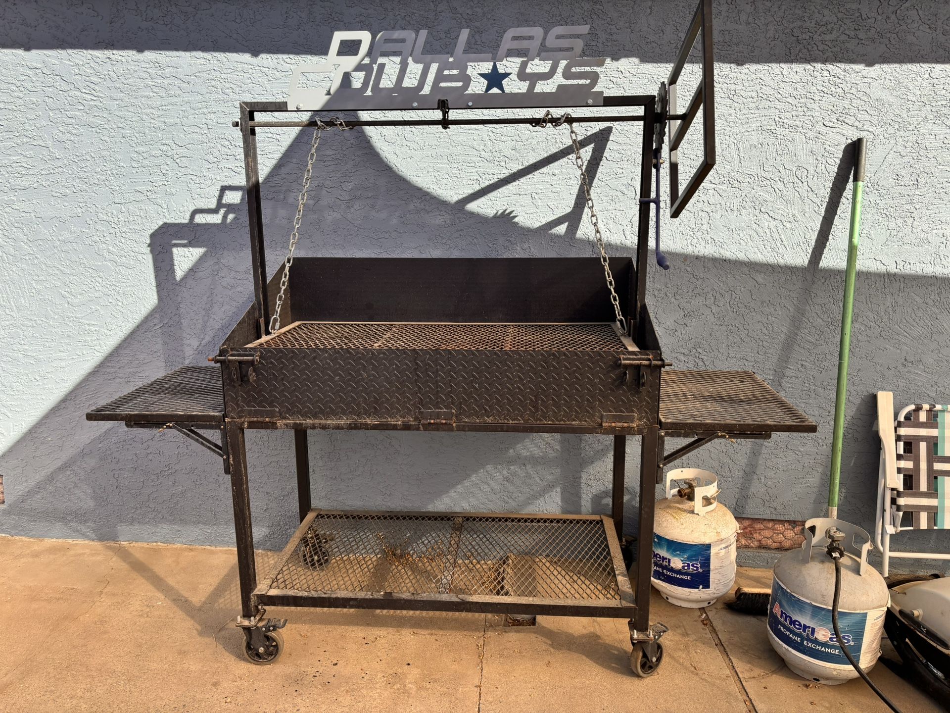 Custom made 45”x23” cooking area 81” total width Grill grate has chain to lower and raise Folding sides 4 wheels (all swivel)