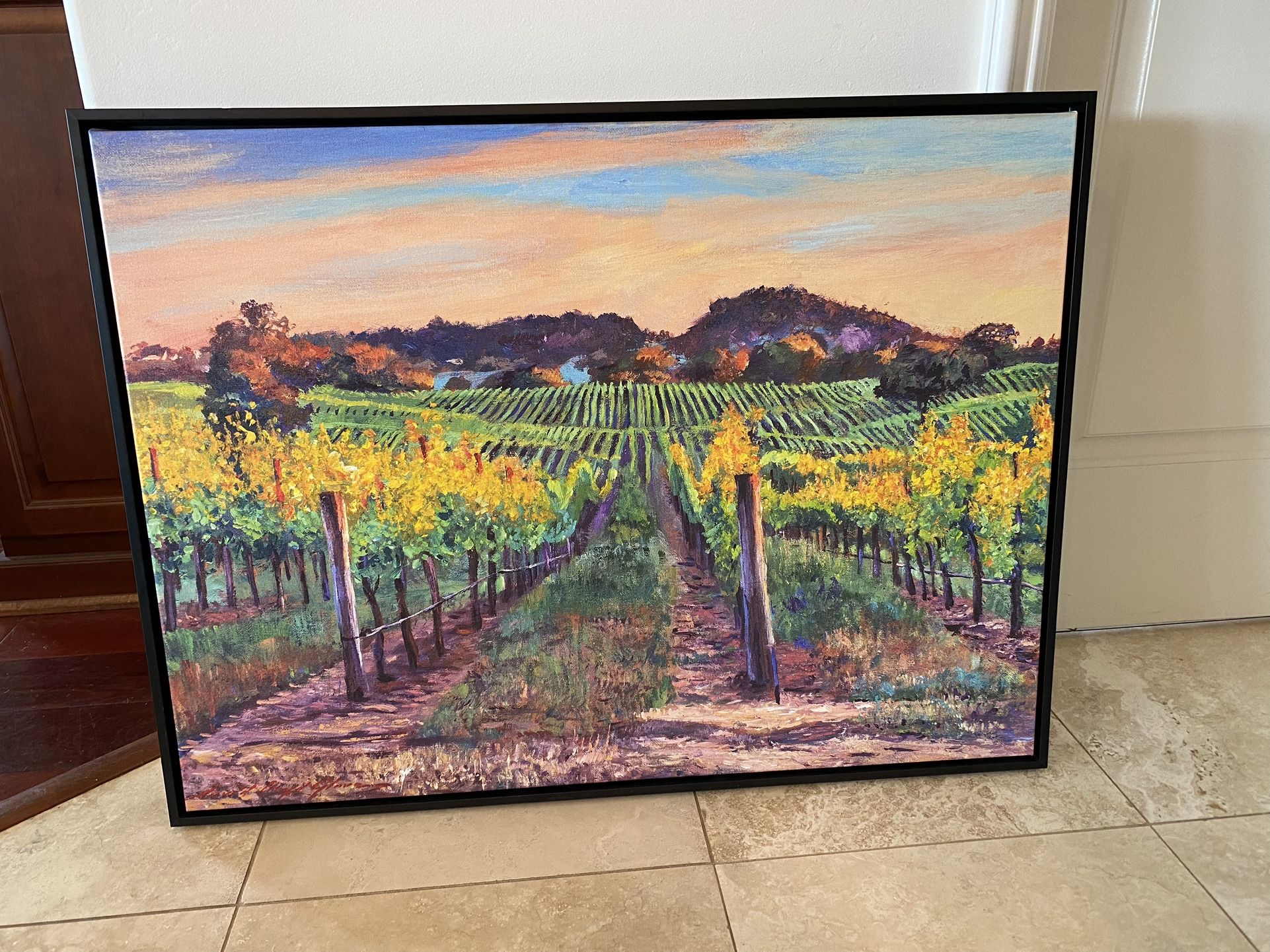 Autumn Harvest Napa Valley Vineyard by David Lloyd Glover Product: Image Size: 36" x 26.5" Total Size: 36.625" x 27.125" Print Material: Glossy Canvas Frame: CF5 Large Canvas Floater - Black (CF5) Finishing: Gallery Wrap Stretched Canvas Print - 1.5" Stretcher Bars Mirrored Image Sides Price Paid:$604.00 (What I paid) I AM SELLING IT FOR $80 There is a small nick in the upper left side but is barely visible-please see photo other than that it is in brand new pristine condition Please see photos for size and other info