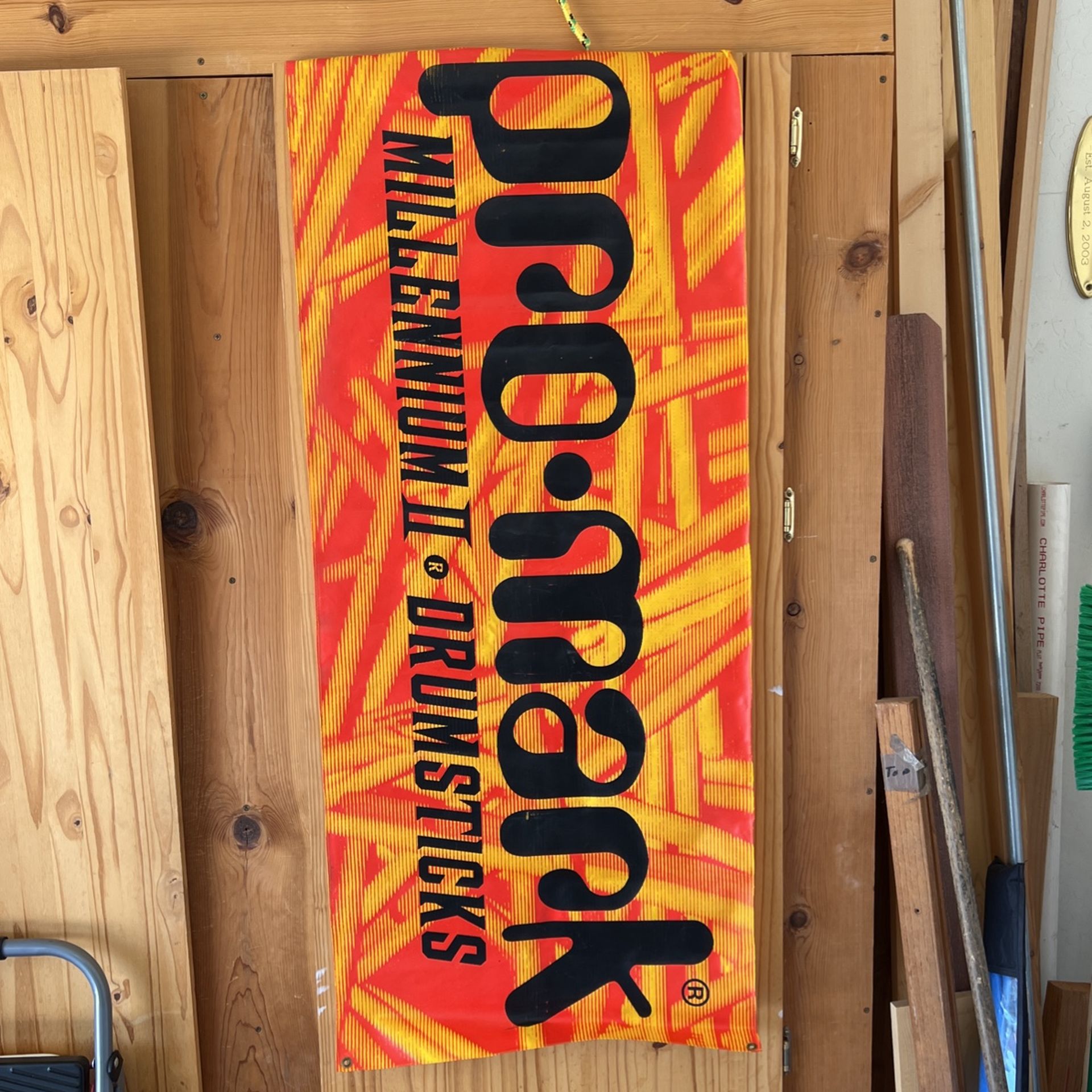 Drum shop banner for your streaming background or wall decor. Vintage late 90’s Millenium II Drumsticks banner in orange and yellow from Pro-Mark.