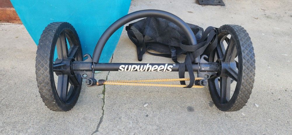 Supwheels SUP standup paddleboard carrier. Comes with bugies and netting for carrying your gear. Easy to put the nose in and wheel your board down to the beach.
