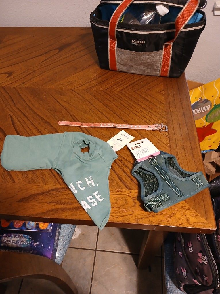 Pet carrier bag. Xs green harness. Xs hoodie. Xs collar. In Manteca, CA $30 for all items