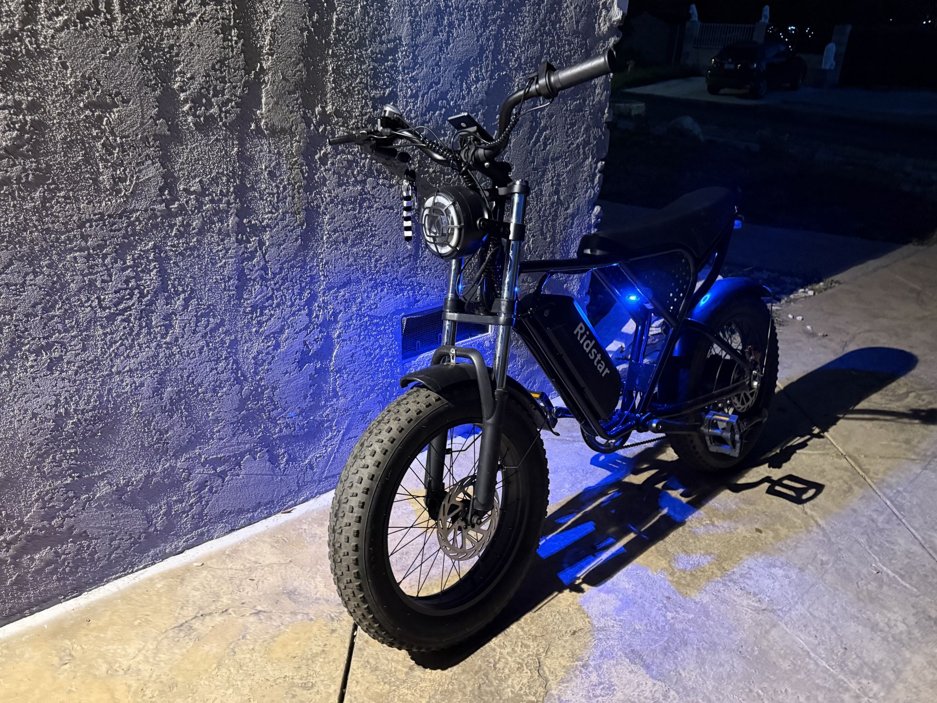 Awesome Ridstar electric bike. Has fat tires for smooth rides. Disc brakes for good stopping power. Front headlight and rear taillight are on it. Super fun to ride. 1500W 34MPH 50 mile range I changed the throttle to full twist there is no front break and there is under glow LED lights 2 sets of keys for battery and bike i also have the charger No problems with the bike Only 520 miles on it Feel free to put in any offer
