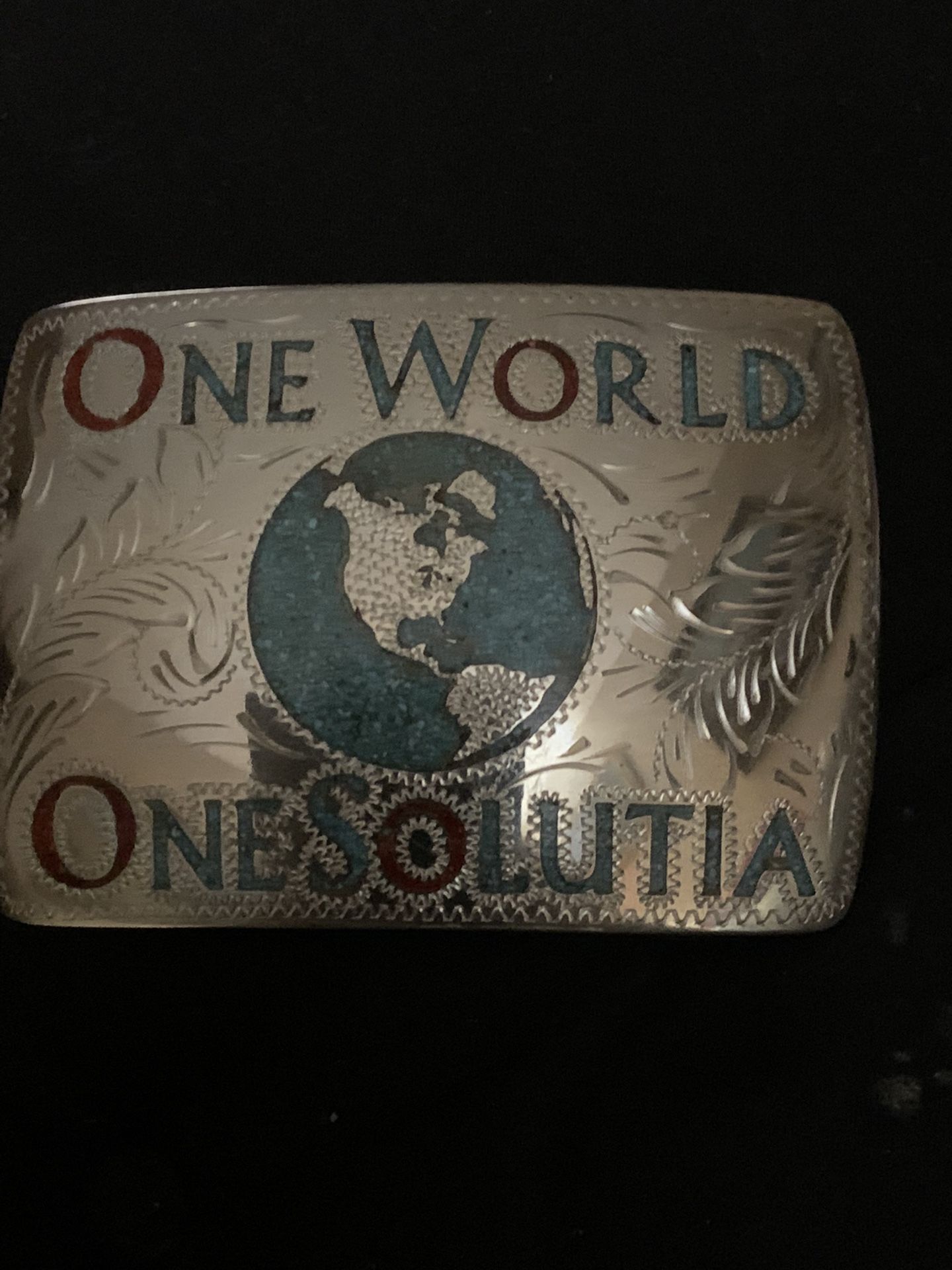 Handmade Belt Buckle Engraved One World One Solutia Silver Tone Unisex