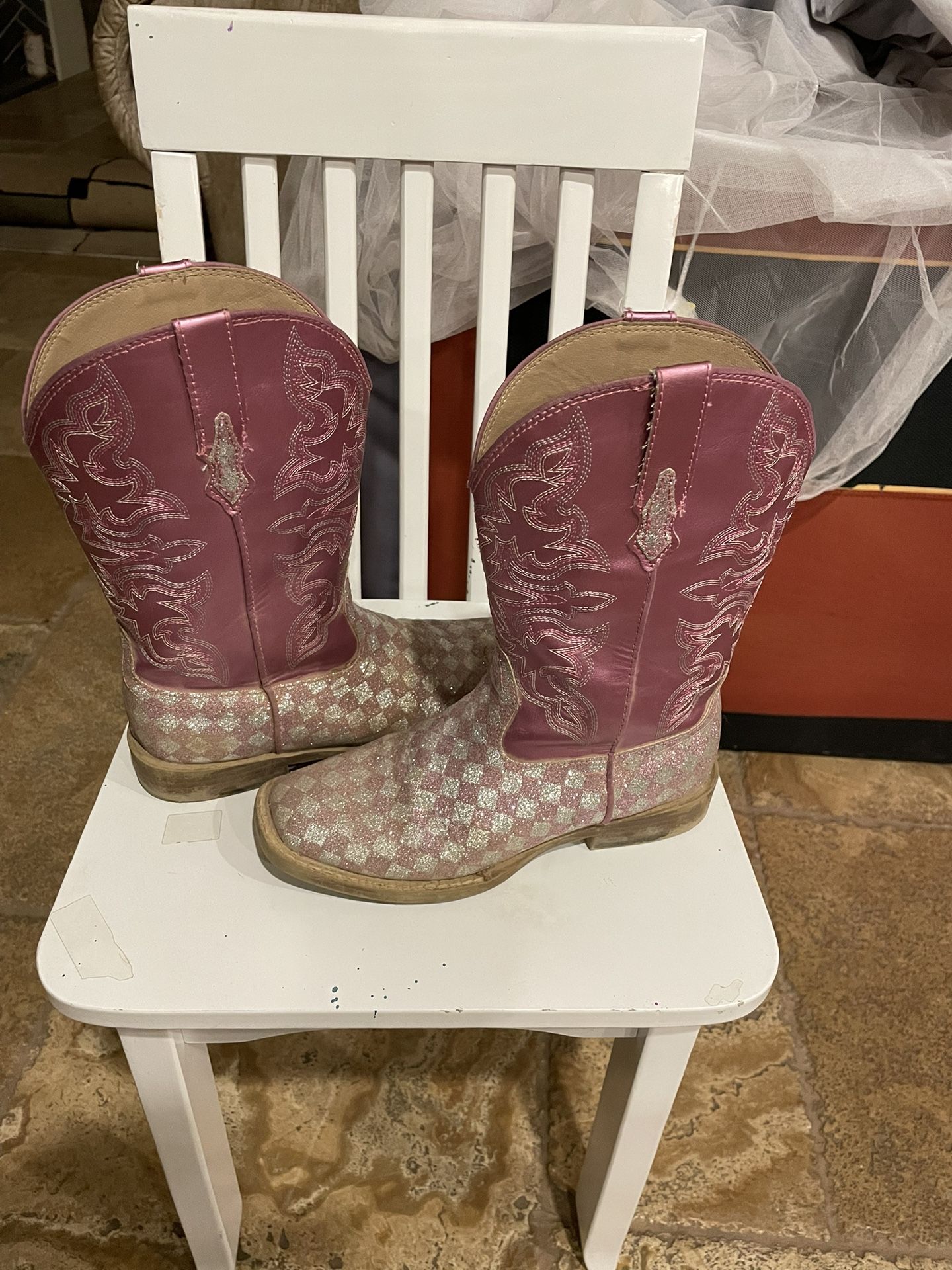My daughter LOVED these boots and was always getting compliments on them. Size 2 real genuine leather. Roper Brand. No holes and they are in good condition. Serious Buyers Only, No low ball offers. Over $100.00 brand new. Get them before they are gone. Thank You