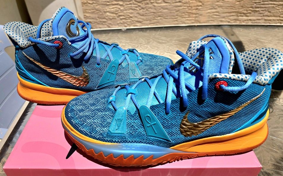 The mysteries of ancient Egypt are a source of endless fascination for Kyrie. Partnering with Concepts, the Kyrie 7 'Horus' is inspired by glazed ceramics from ancient Egypt—objects once considered magical that represented the power of the gods. Blue hues throughout the multidimensional upper draw from the colours of the artefacts, and Egyptian symbols are worked into the forefoot bands, heel and Swoosh designs. In excellent condition size 12