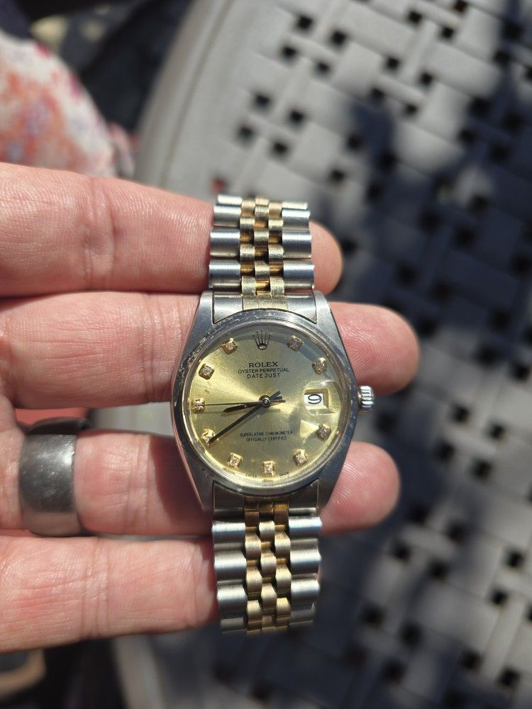 1966 Rolex Oyster perpetual Datejust Superlative Chronometer Stainless/18K Gold rolex numbers 6694 1504705 champagne dial diamond in working condition timing checked. Missing Bezel 2001 bracelet i think