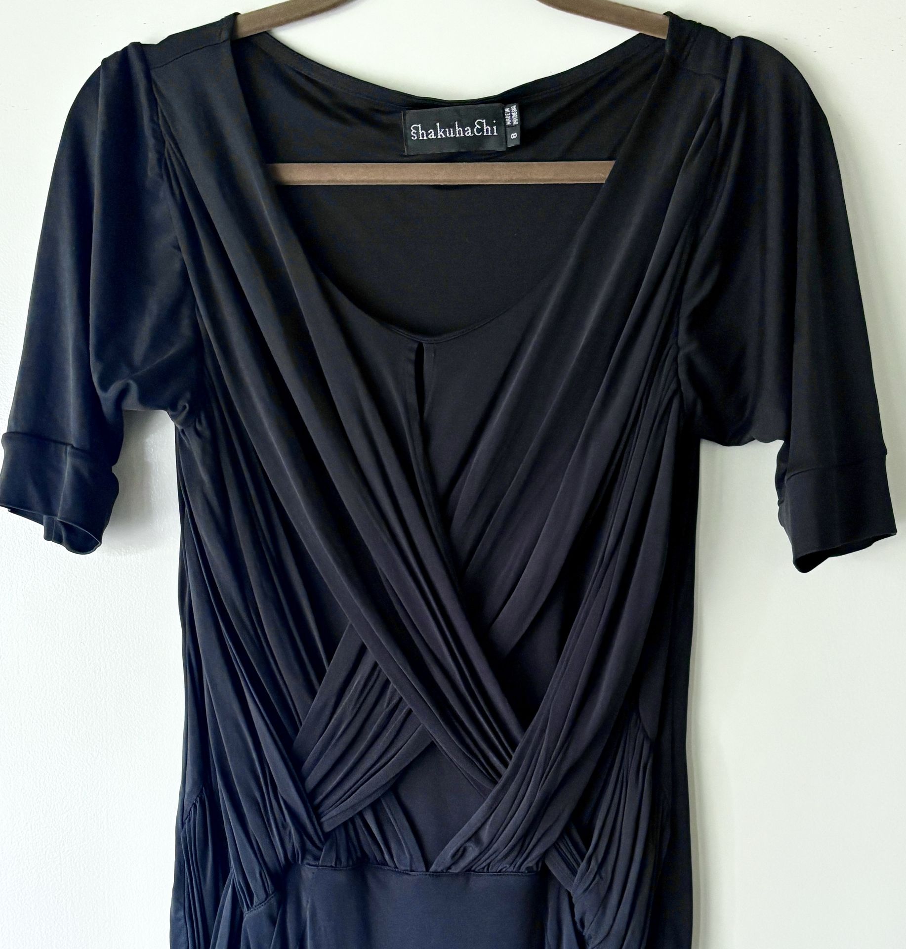 The Shakuhachi Black Layered Mini Dress with Pockets in size 8 is a stylish and versatile piece perfect for various occasions like weddings, parties, and formal events. Made from a comfortable polyester blend jersey fabric, this dress features a round neckline, short sleeves, and a pullover closure for convenience. The black color and layered accents give it a sophisticated and classic look, while the inclusion of pockets adds both functionality and flair. This mini dress from Shakuhachi is designed for the fashion-forward woman who wants to make a statement with her outfit. Main picture highlighted to show details. Measurements lying flat: - Bust: 15.5” - Length: 32” from shoulder to hem