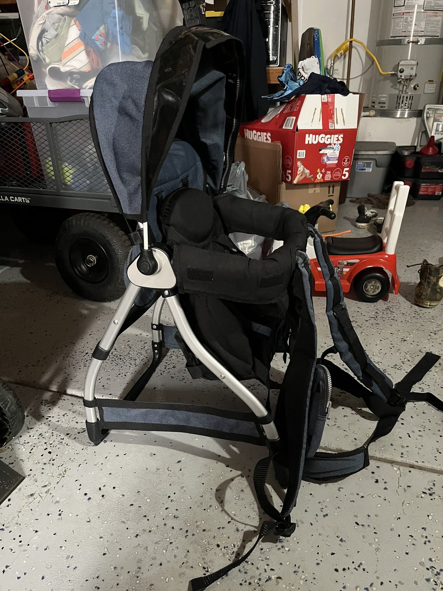Chicco backpack toddler seat. 6-36 months recommended up to 40lbs. Navy/black Poly with sunshade and removable storage bags. Can free stand for instant child seat. Light weight, easy to load and wear.