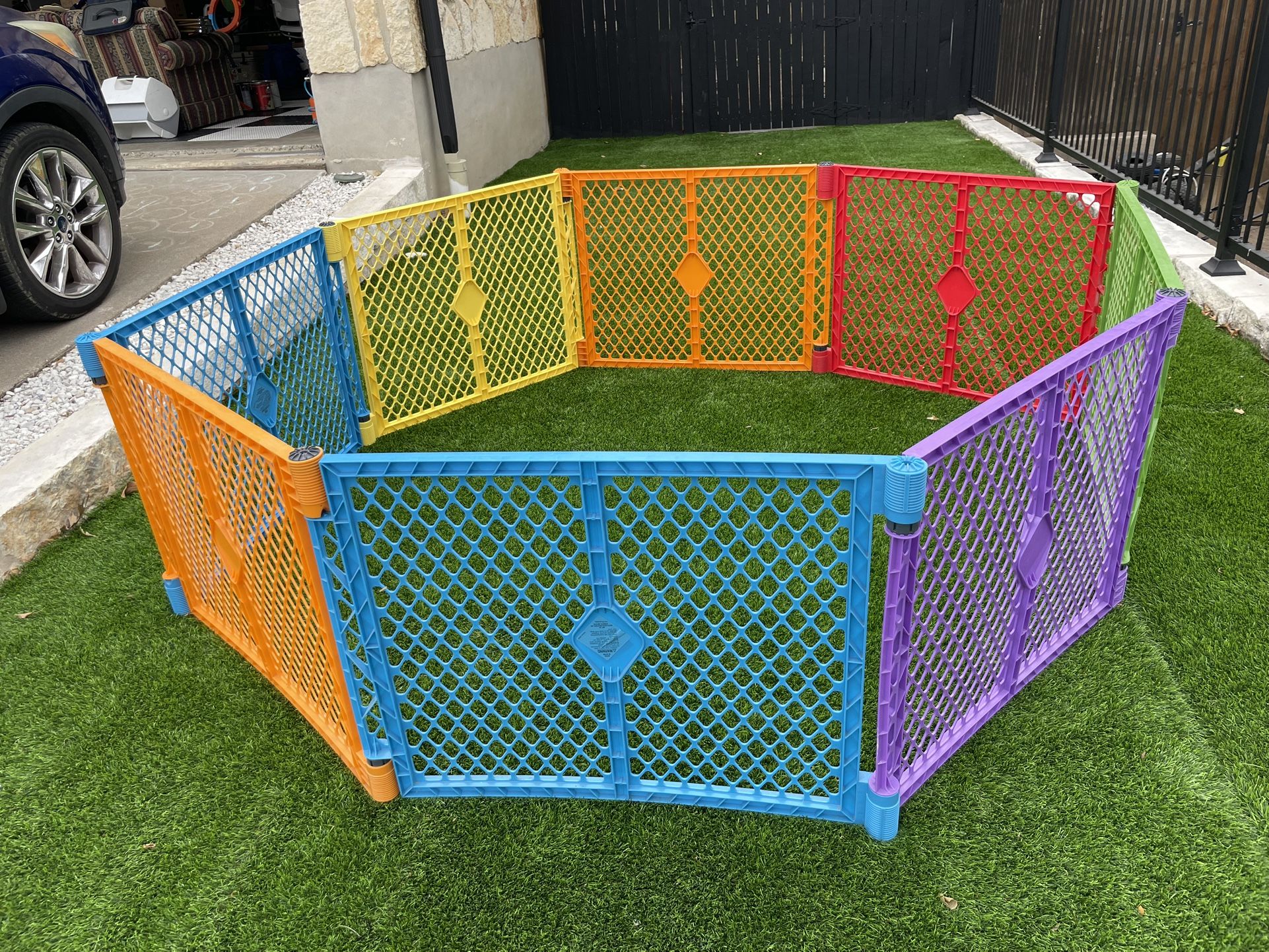 Versatile, portable, and easy to use panels that are reconfigurable. Great for indoor and outdoor playtime. Extra strong self positioning hinges for sturdiness. Each panel is 32”w x 26”h. Encloses up to 34 square feet.