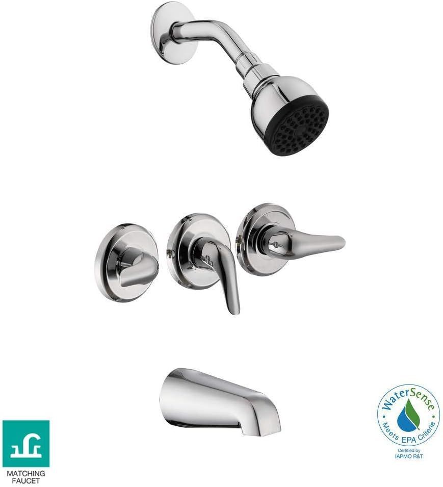 VAN NUYS AREA. Glacier Bay Aragon 3-Handle 1-Spray Tub and Shower Faucet in Chrome (Valve Included) Brand Glacier Bay Color Chrome Finish Type Chrome Number of Handles 3 Handle Material Brass Item Weight 3.4 Pounds Chrome finish Single-function, fixed-mount shower head provides a consistent flow of water WaterSense certified, this faucet has a 1.8 GPM rate to help reduce water use, Washerless 1-piece cartridge ADA compliant lever handles Advanced installation required - consult a plumber or professional before installing this product