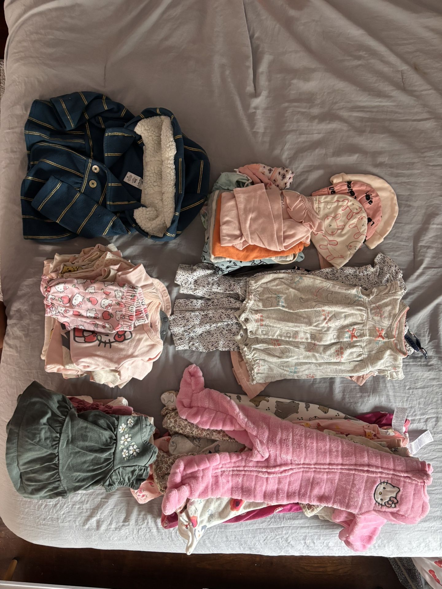 Baby girl clothes 52 pieces size 0-3 months and 3 months Includes carters, gerber, Nike, hello kitty brand, onesies, Huggies, etc. comes from clean no pet no smoke home.- -9 one piece sleepers 1 Sherpa jacket 4 rompers/ dresses 3 beanies 3 sets of gloves 9 long sleeves 8 bottoms 15 onesie shirts 52 pieces