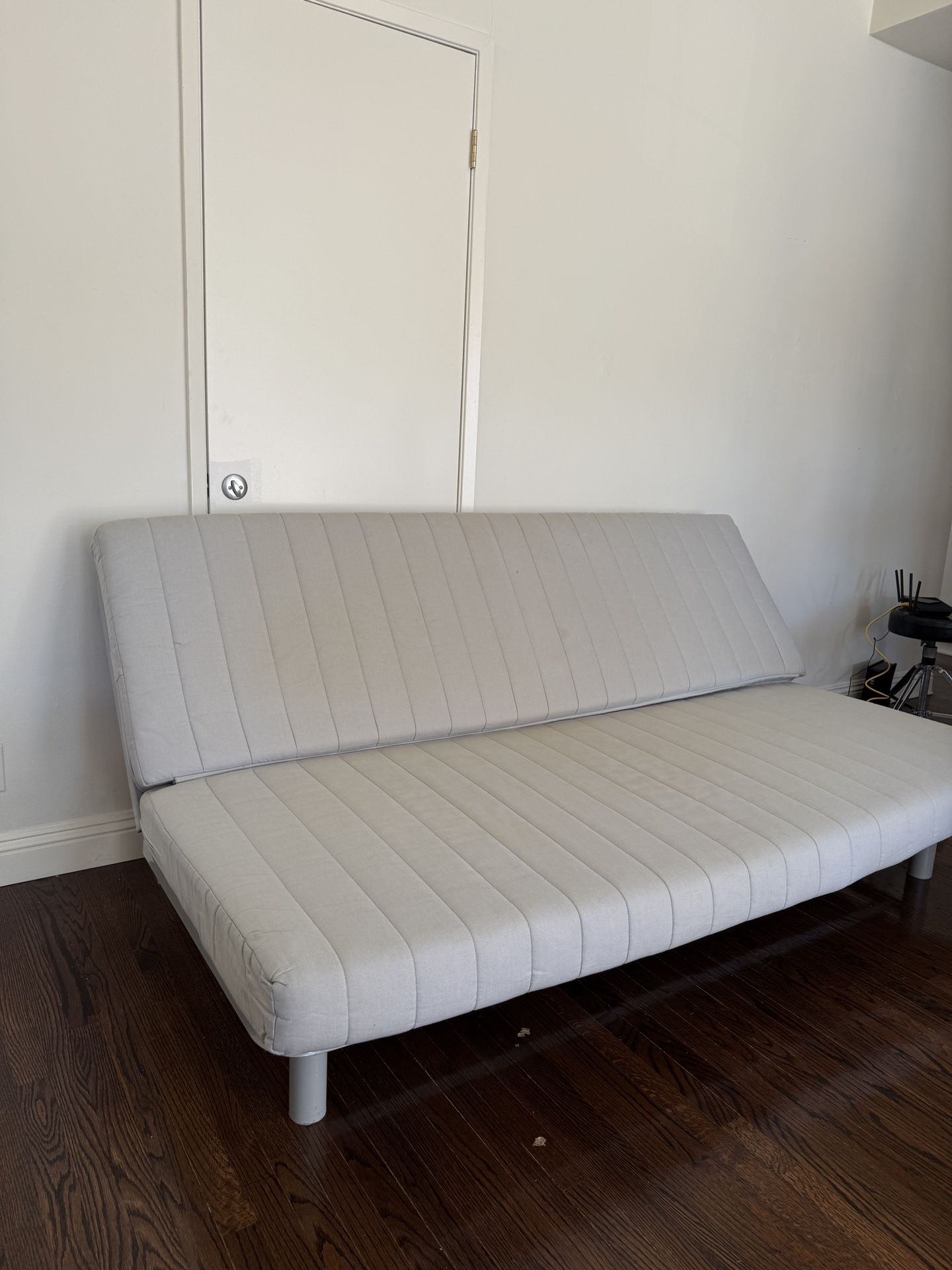 If it's up, its avail! must go- 150 OBO :) Sturdy yet comfy futon bed / couch with grey cushion that zips off to wash PLUS another washable navy cover (faded but nice as extra cushion) Frame made of grey metal and wood. Very easy push to lock system to transform into flat bed or lounge couch. Full size bed when flat. Small subtle stains on some areas as pictured. Metal slightly bent but doesn’t affect its use all all. Pickup OR I have awesome movers who you can hire (Gurrolas_socal_movers on insta) Leg height: Couch: 79 length x 34 height, 44 wall to front As bed: full size bed, 79 x 55
