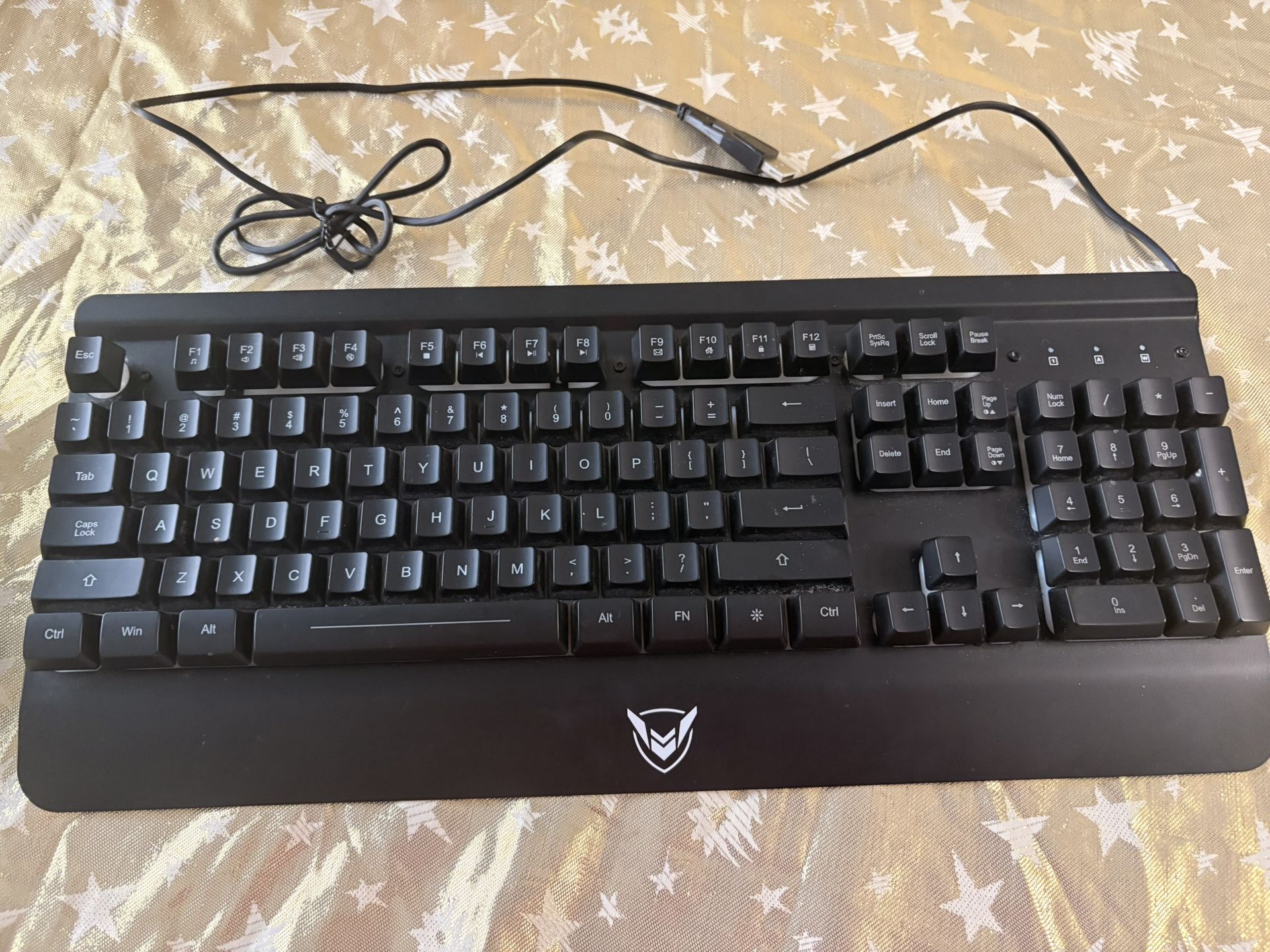 This is a Pictek or MPOW PC268A wired gaming keyboard. Features a QWERTY layout and English language keycaps. Equipped with rainbow LED backlighting with multiple lighting modes and adjustable brightness levels. Designed to be spill-resistant with drainage holes at the bottom. Keycaps are detachable for easier cleaning. Cash or Venmo accepted