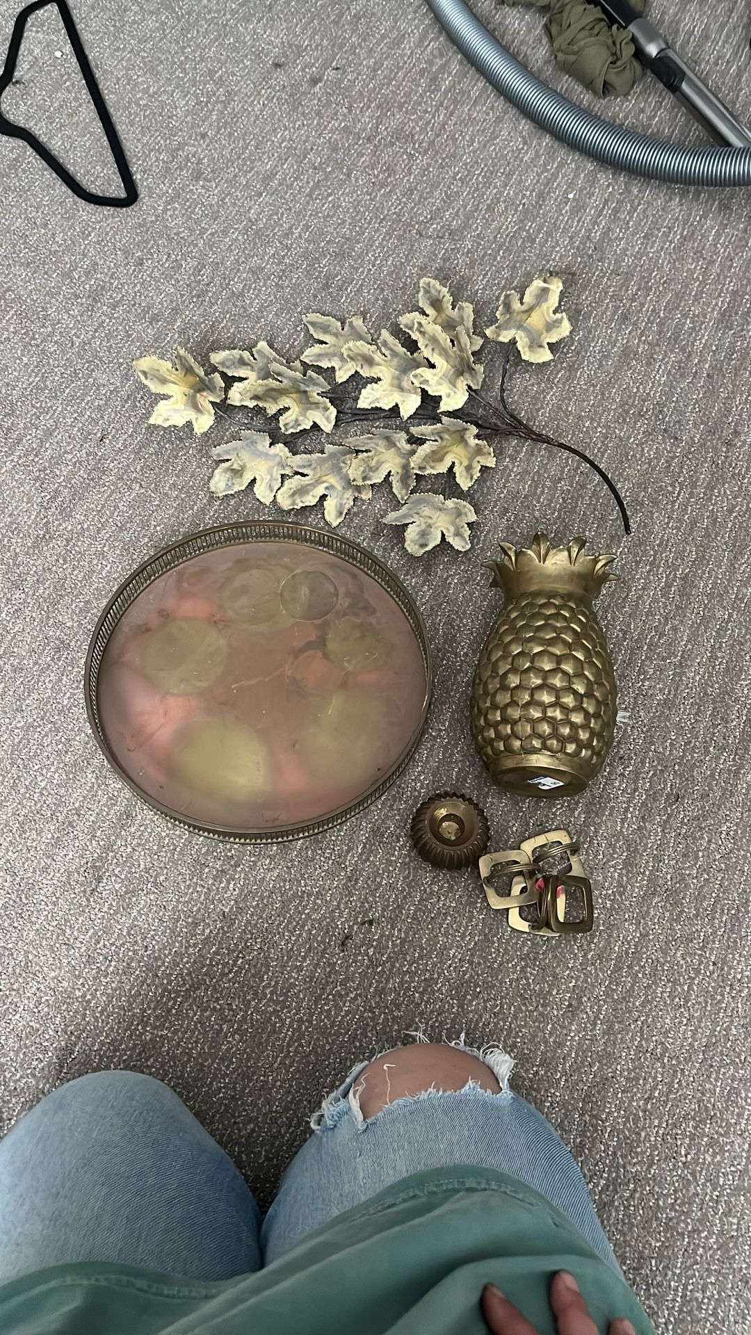 Vanity/ bar tray- 15 Maple leaf wall decor- 15 Pineapple vase- 15 Napkin rings- 5 Candlestick holder- 5 Used , has patina Mcm, mid century, vintage I can ship. Message me so I can make individual listings