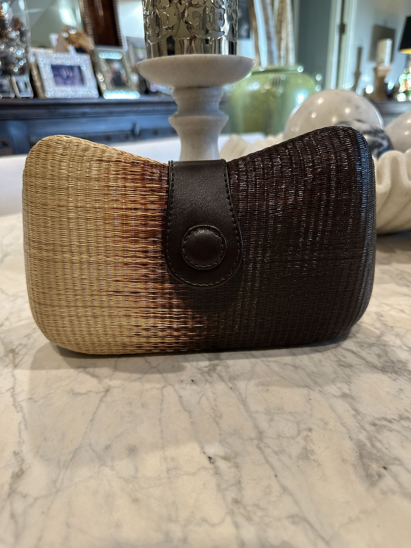 Natural fiber bag by Le Sac. Neutral tans and browns with a brown velvet lining. Silver chain carry or clutch. 10” x 6”. Excellent condition.