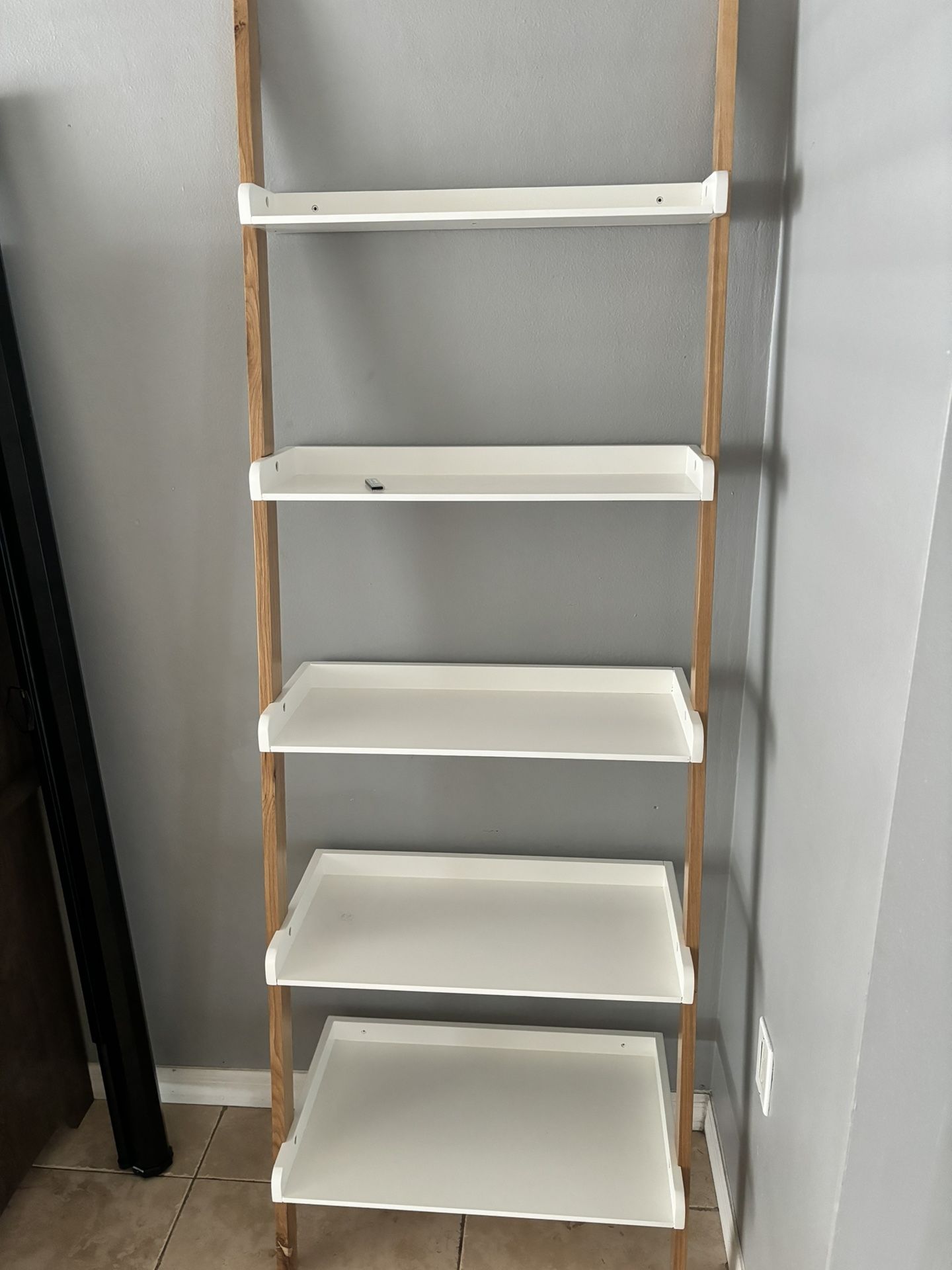 All white wooden shelves that can be anchored in the wall, sturdy and never used, great addition for office or living room and homeschooling. Excellent condition